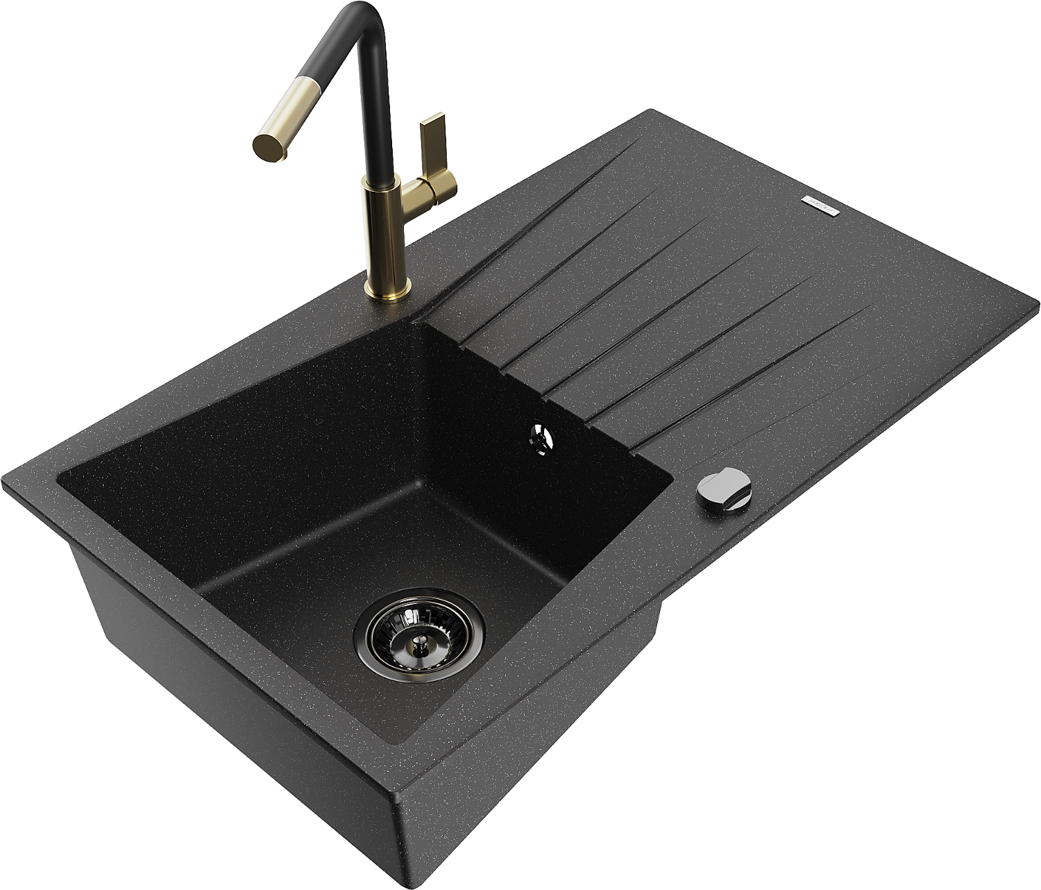 Mexen Cesar granitový kuchynský drez s 1 komorou s odkvapkávačom a kuchynskou batériou Flora, čierny/strieborný