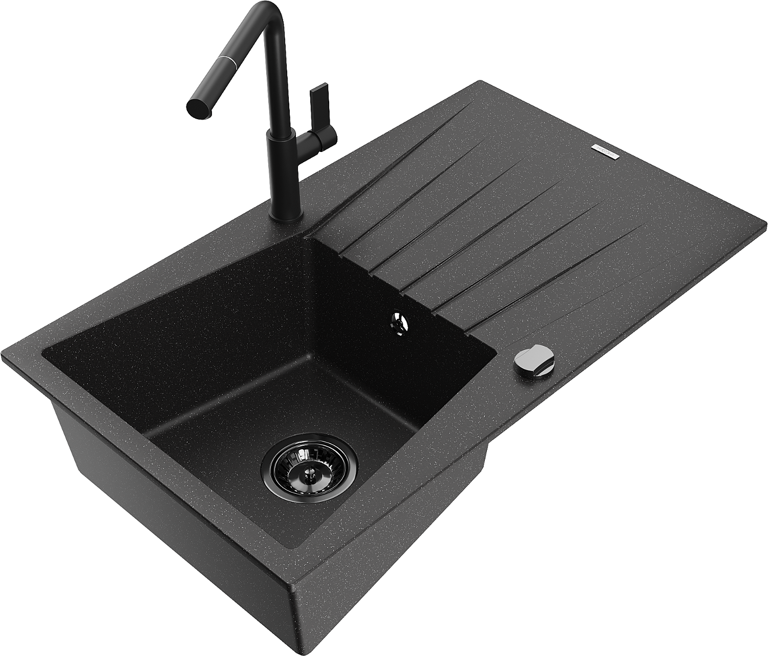 Mexen Cesar granitový drez s jednou komorou s odkvapkávačom a kuchynskou batériou Flora, čierny/strieborný metalik