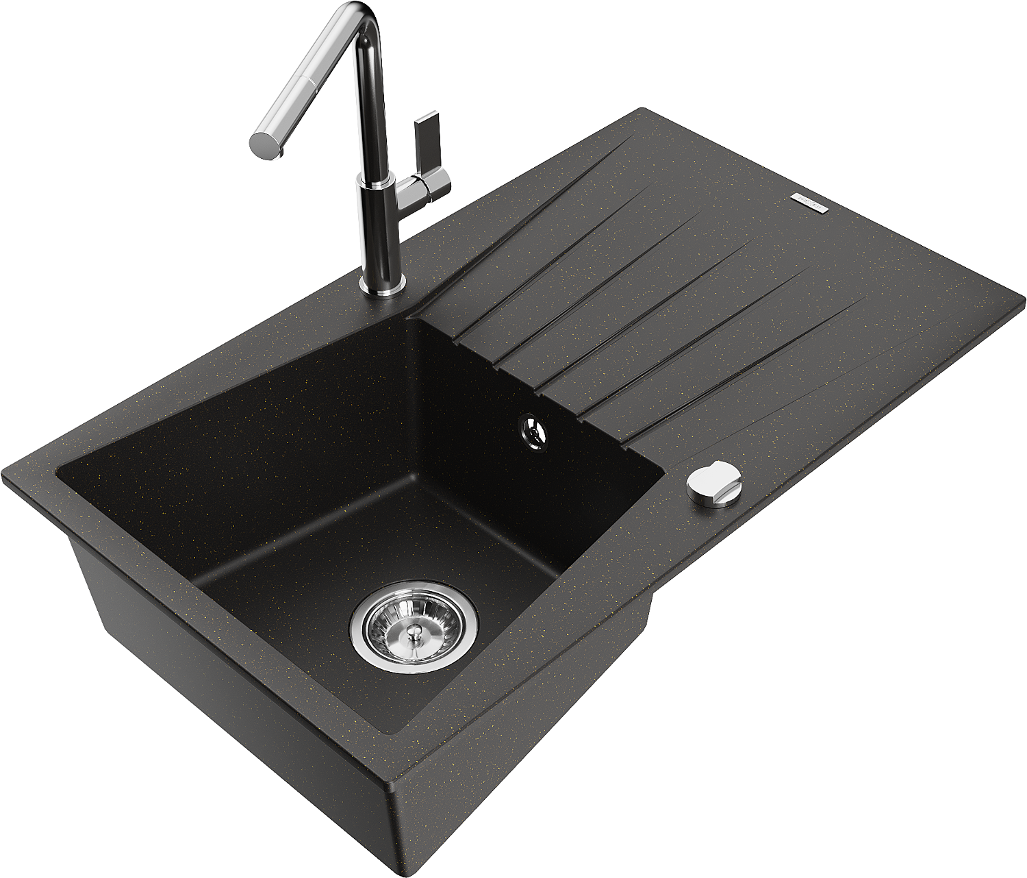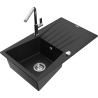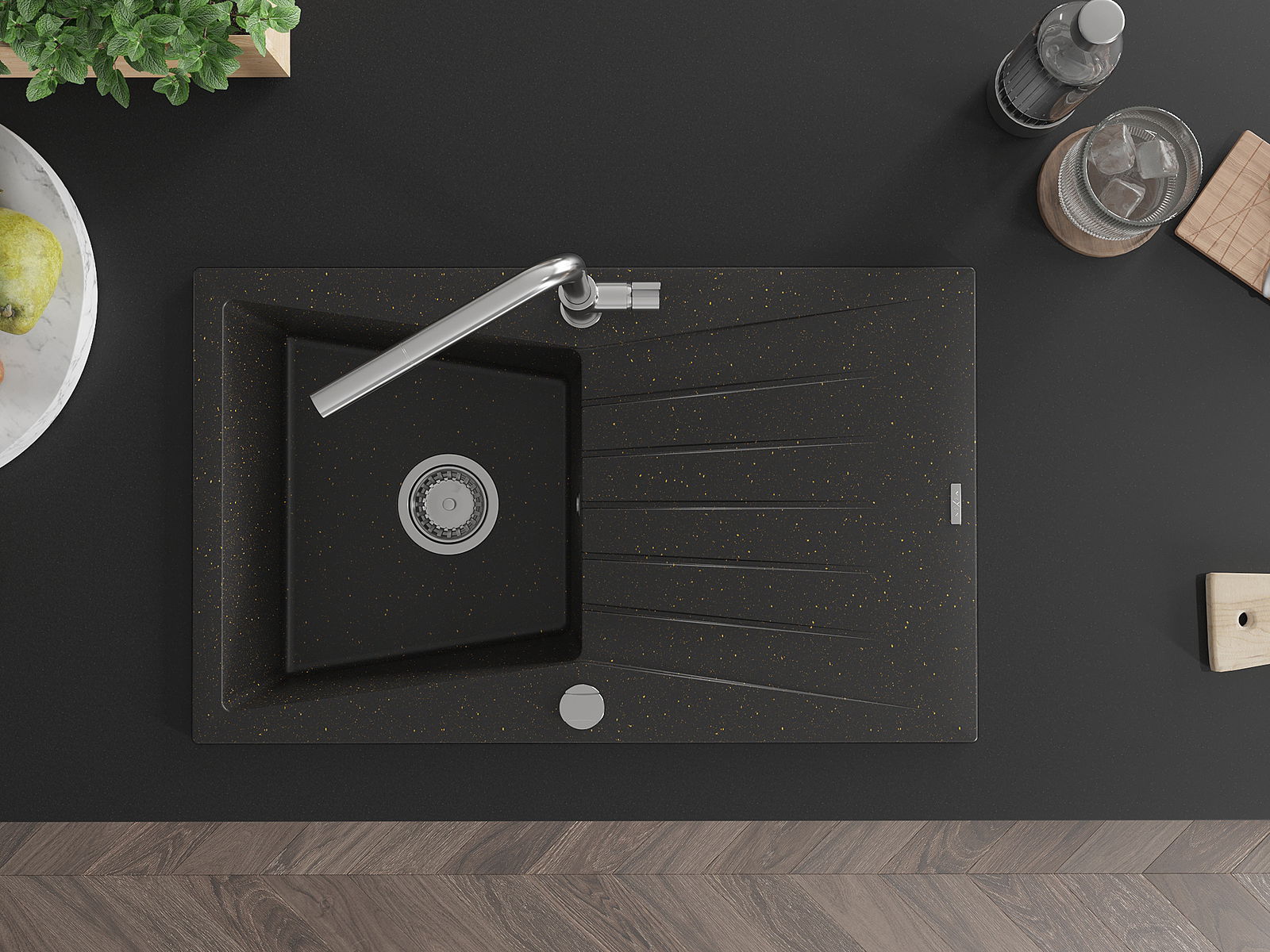 Mexen Cesar granitový kuchynský drez s jednou komorou a odkvapkávačom a kuchynskou batériou Flora, čierny/zlatý metalik