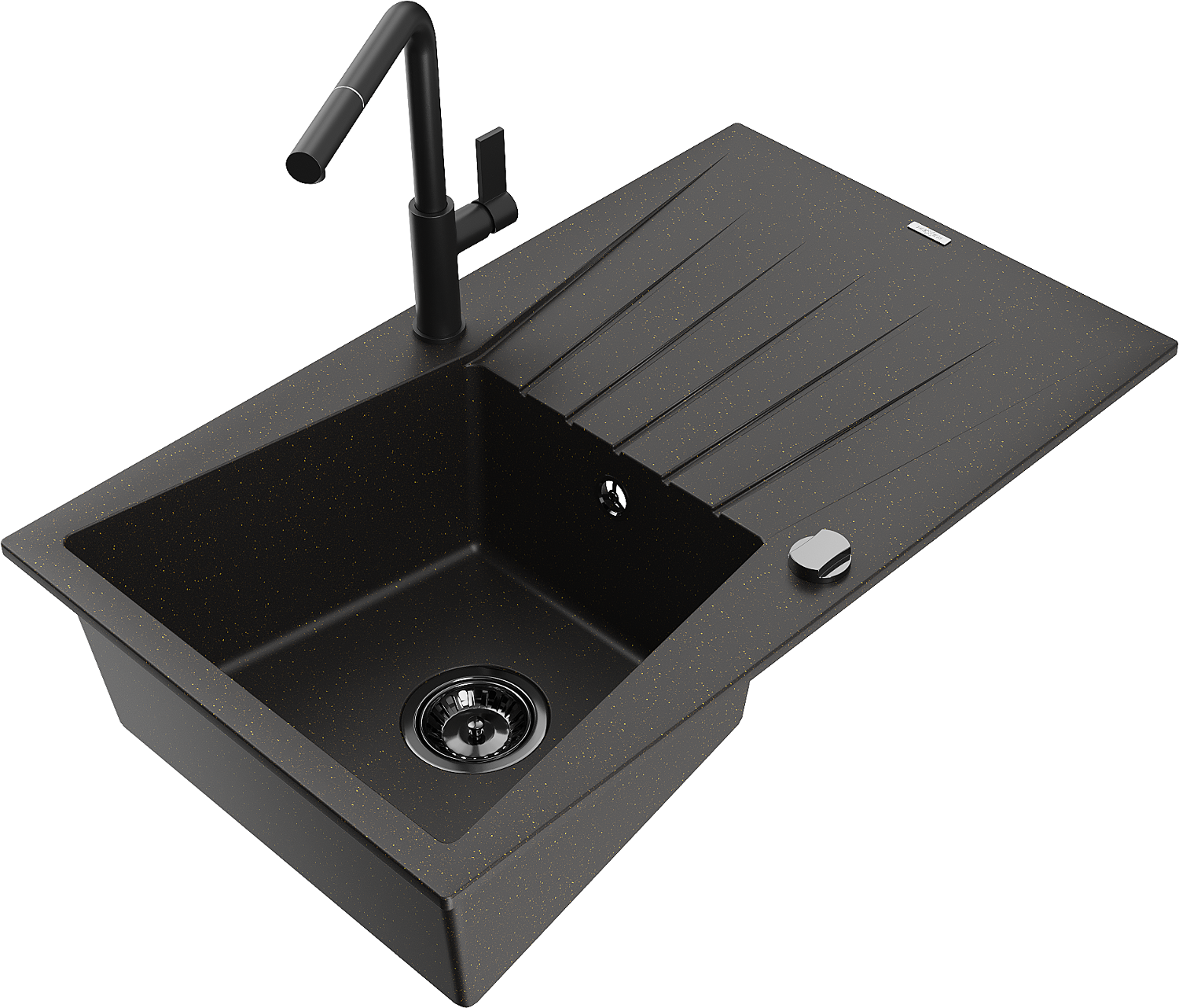 Mexen Cesar granitový drez s 1 komorou, odkvapkávačom a kuchynskou batériou Flora, čierny/zlatý metalický