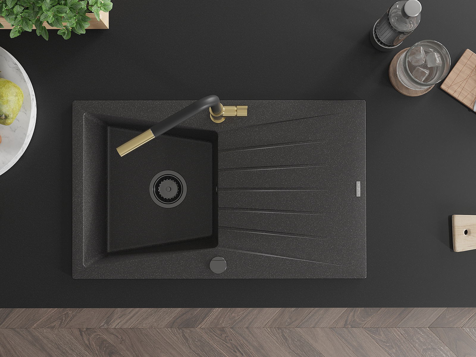 Mexen Cesar granitový drez 1-komorový s odkvapkávačom a kuchynskou batériou Flora, čierny škvrnitý - 6514-76-670401-57-B