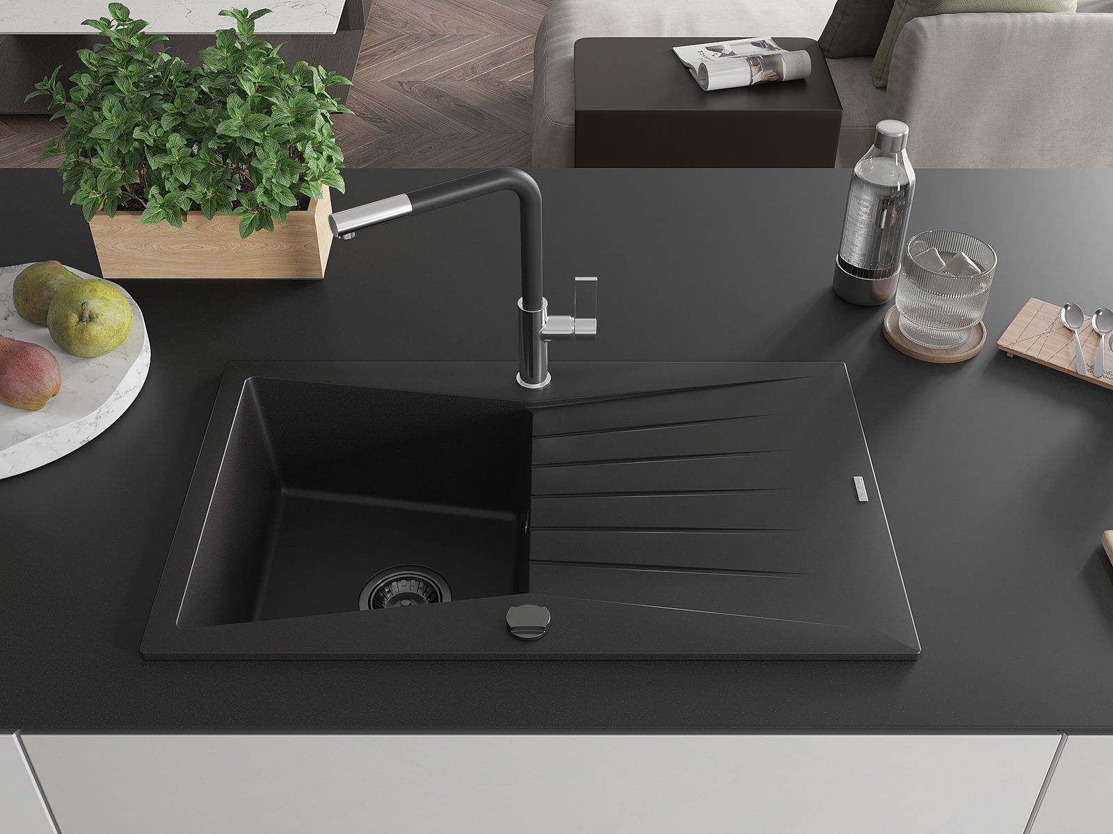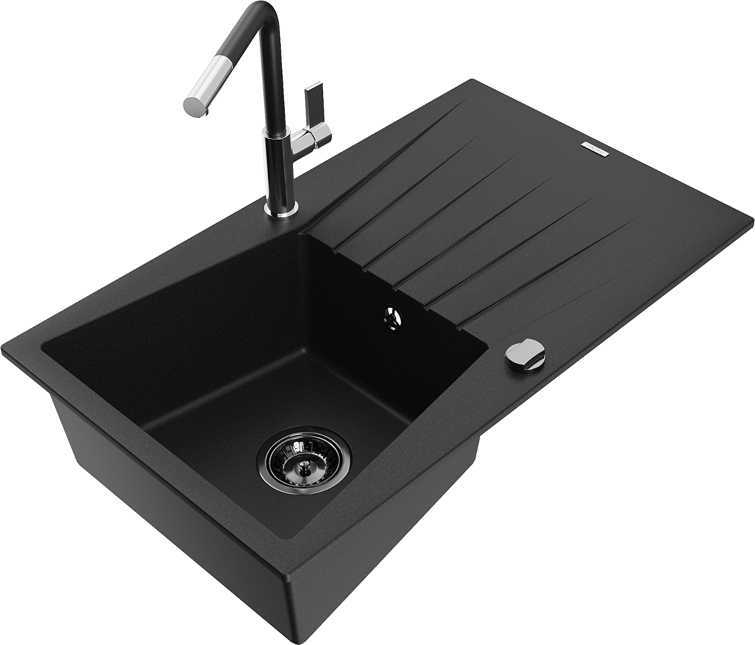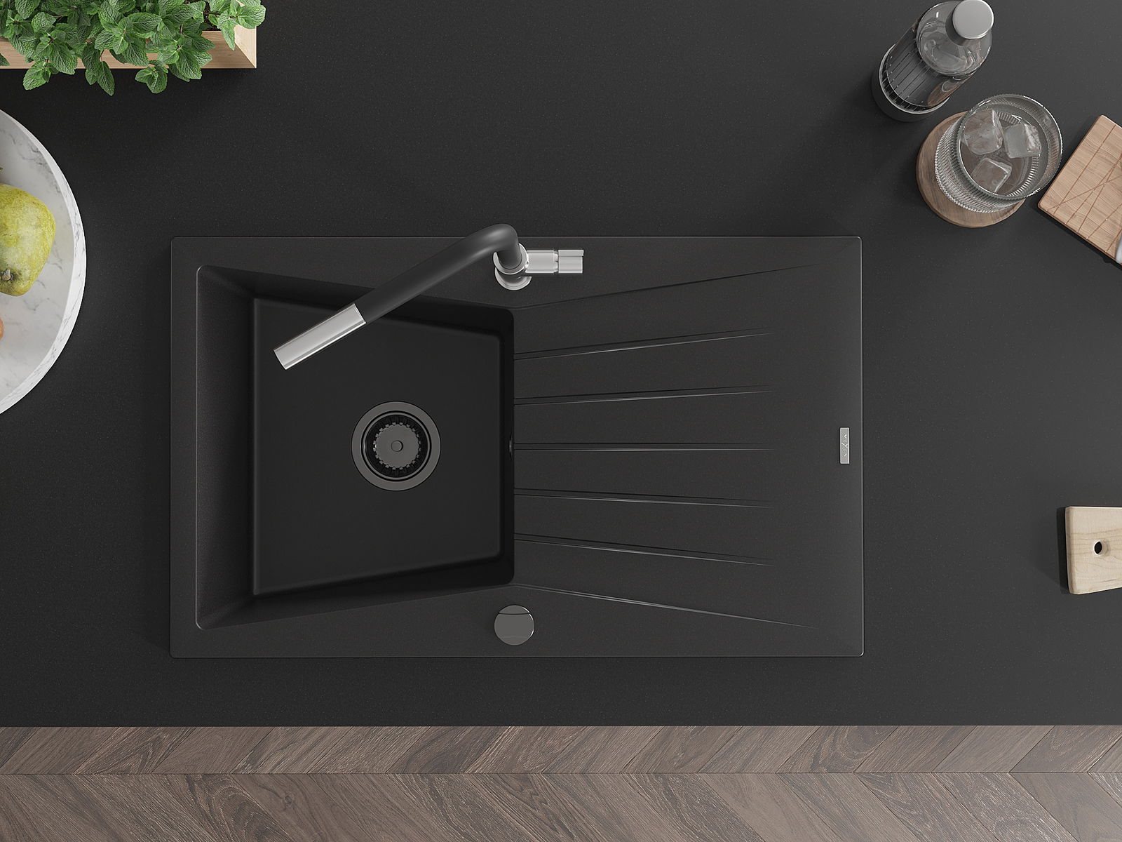 Mexen Cesar kuchynský granitový drez s 1 komorou a odkvapkávačom a kuchynská batéria Flora, čierna - 6514-77-670401-07-B