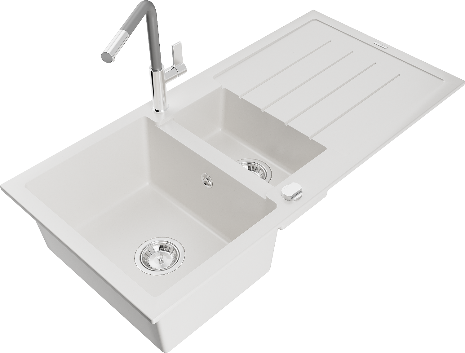 Mexen Andres žulový drez 1,5-komorový s odkvapkávačom a kuchynskou batériou Flora, biely - 6515-20-670401-06