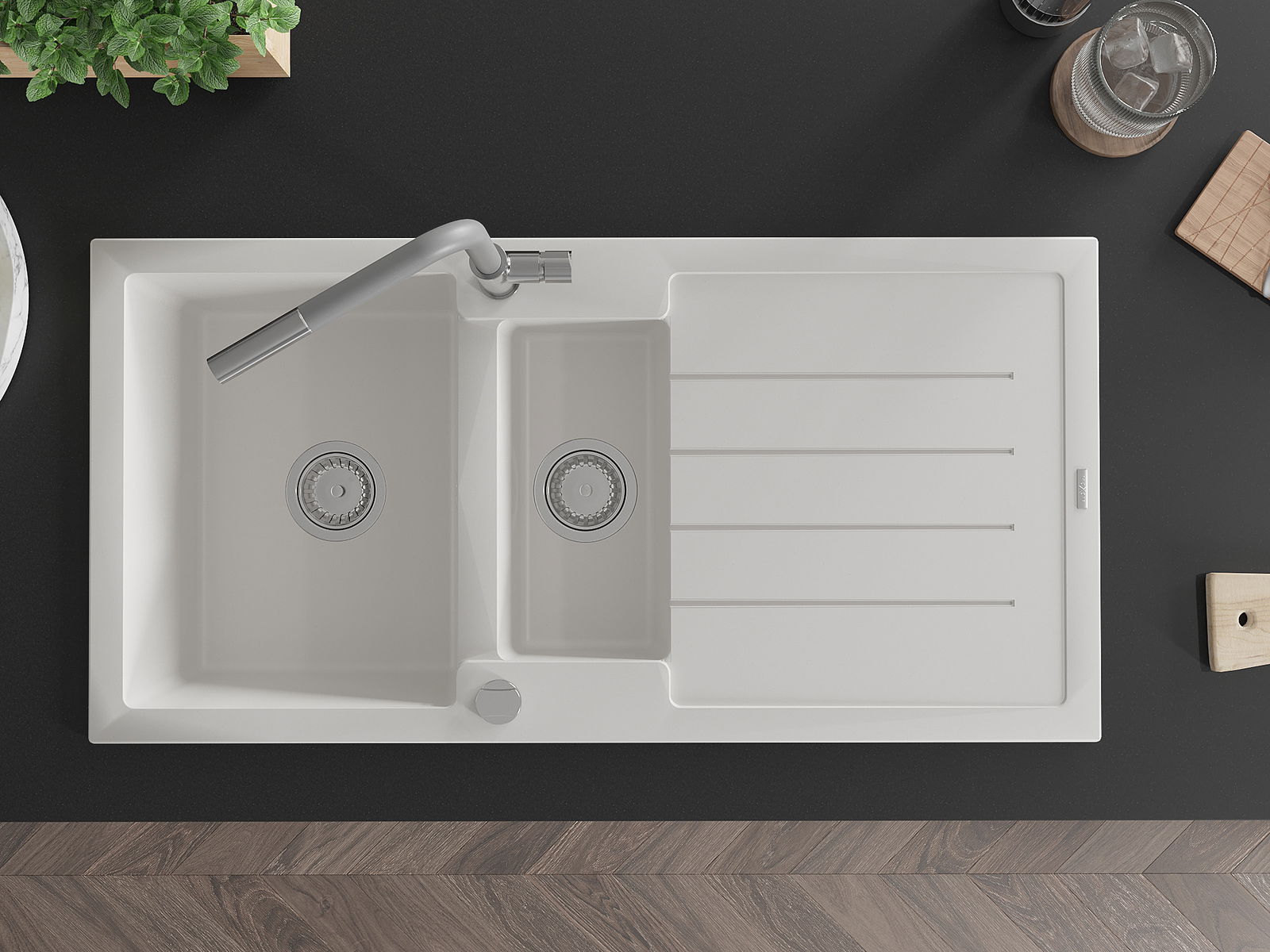 Povrch umývadla je odolný voči škvrnám a sfarbeniu, vďaka čomu sa ľahko čistí a zachováva si svoju farbu po dlhú dobu. Estetický a prakticky dopĺňajúci každú kuchyňu.