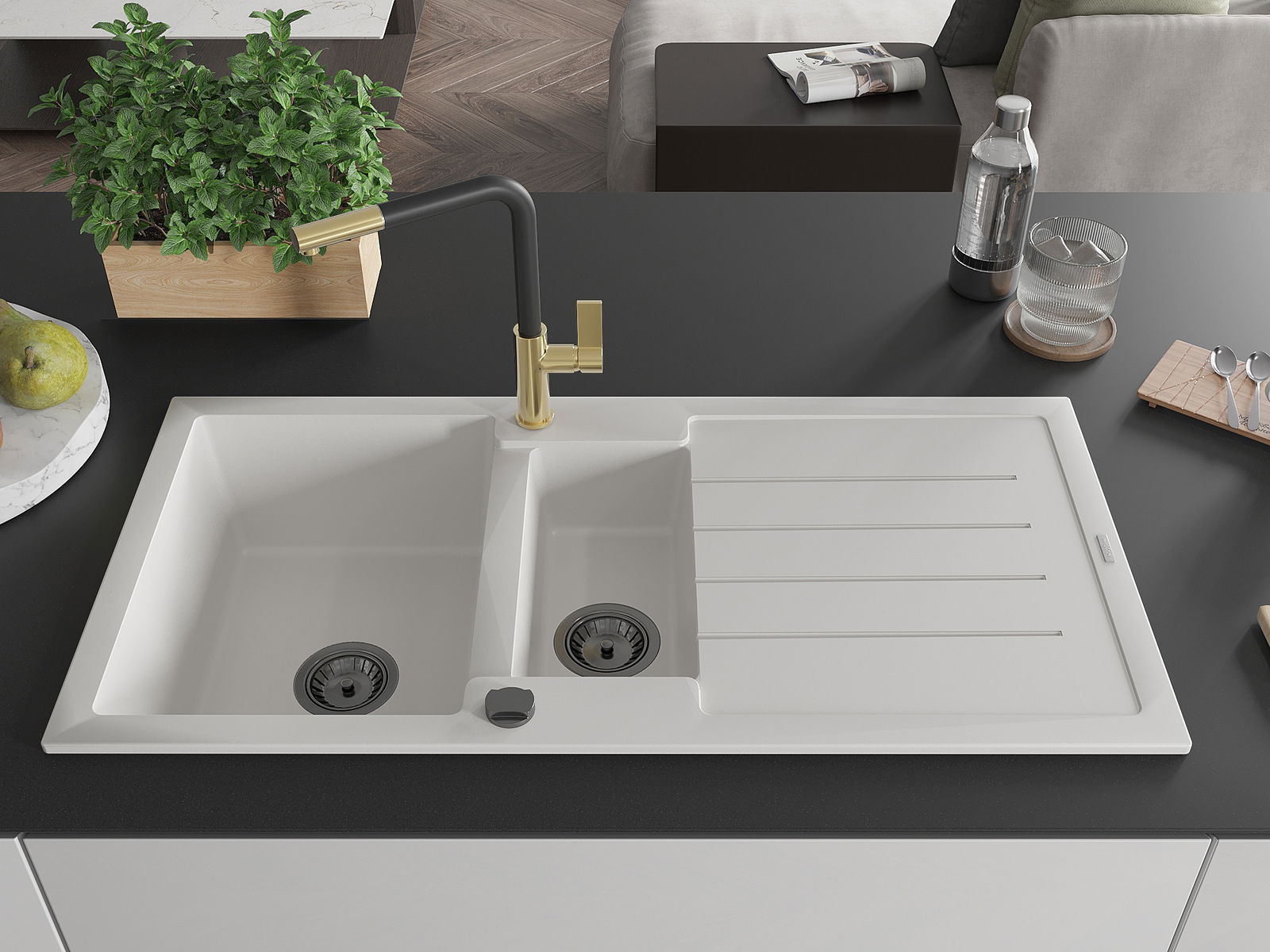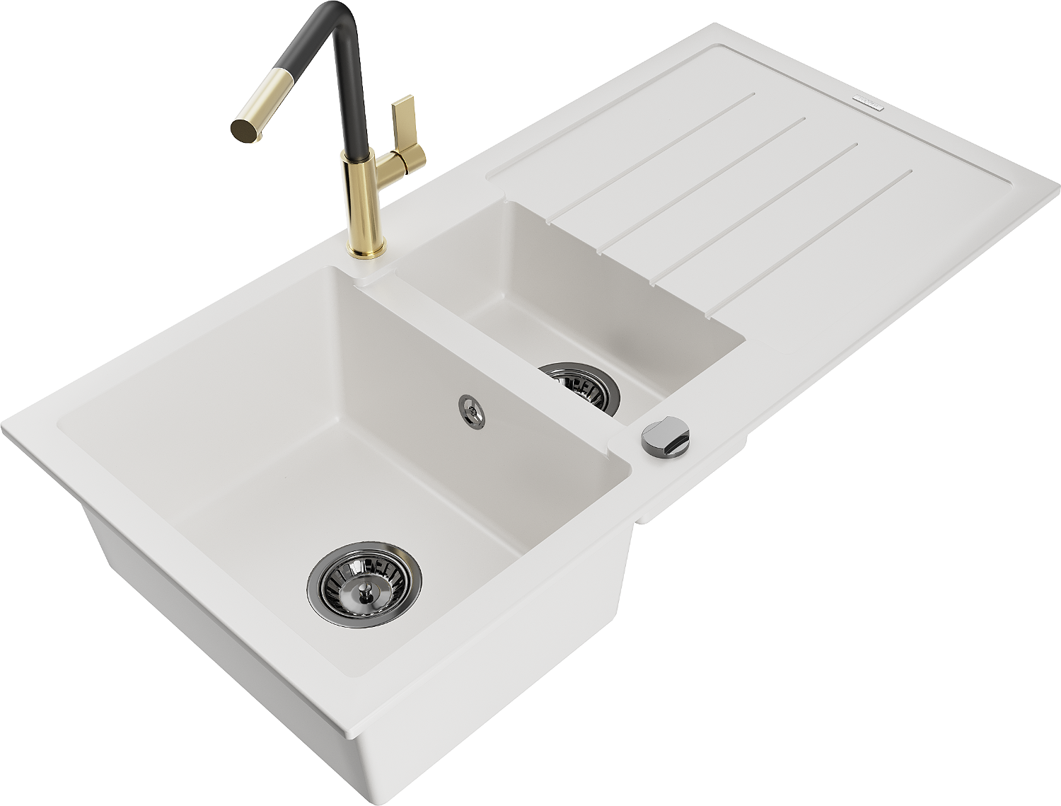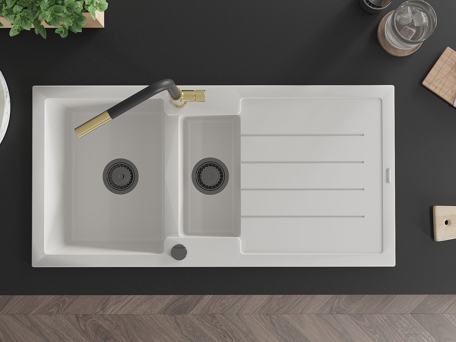 Mexen Andres granitový drez s 1,5 komorami, odkvapkávačom a kuchynskou batériou Flora, biely - 6515-20-670401-57-B