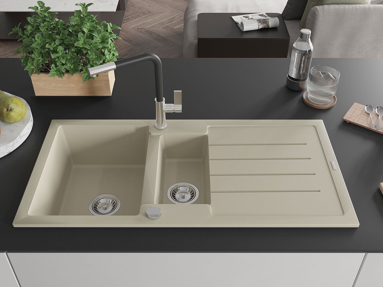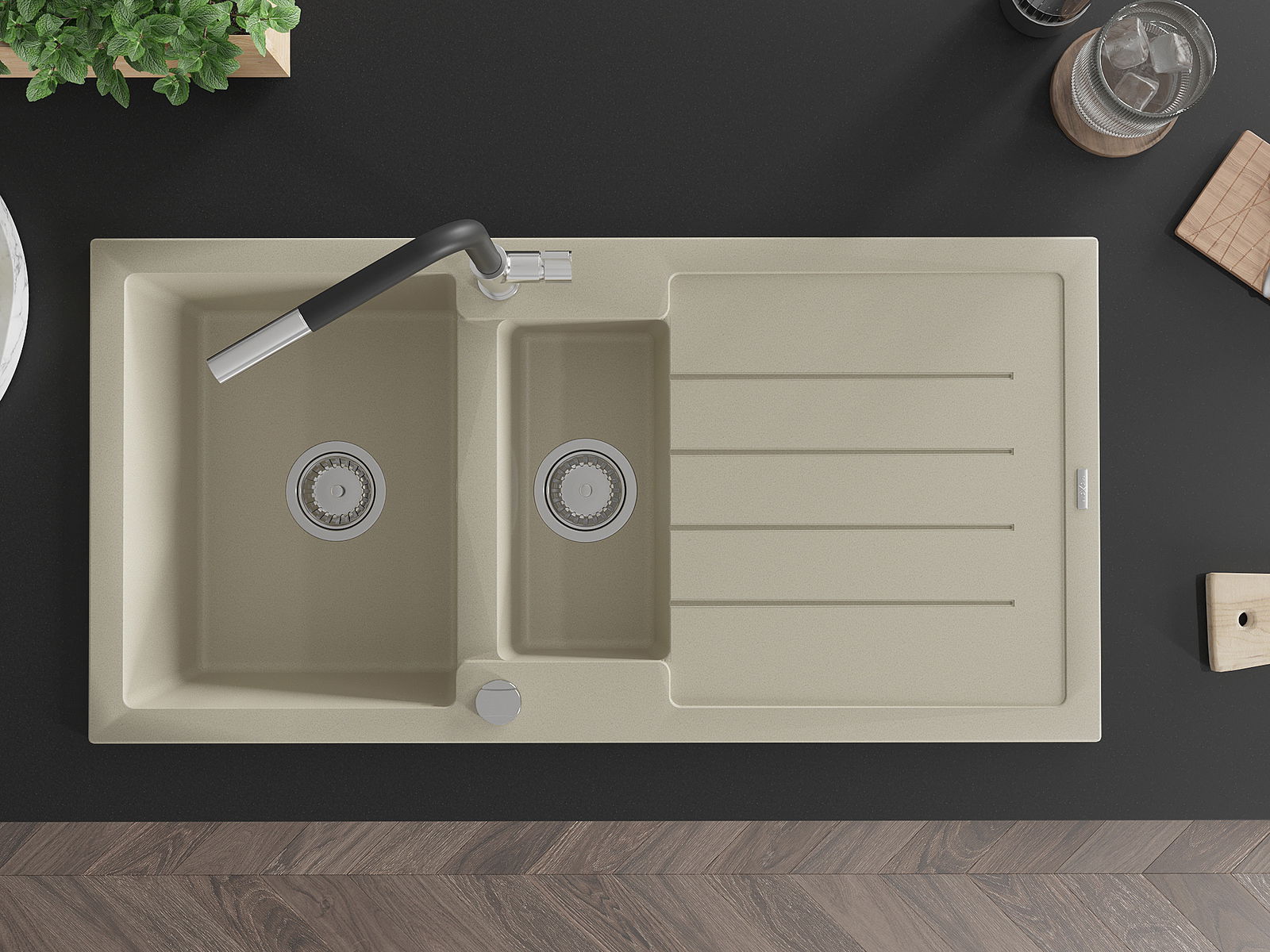Povrch umývadla je odolný voči škvrnám a sfarbeniu, vďaka čomu sa ľahko čistí a zachováva si svoju farbu po dlhú dobu. Estetický a prakticky dopĺňajúci každú kuchyňu.