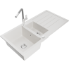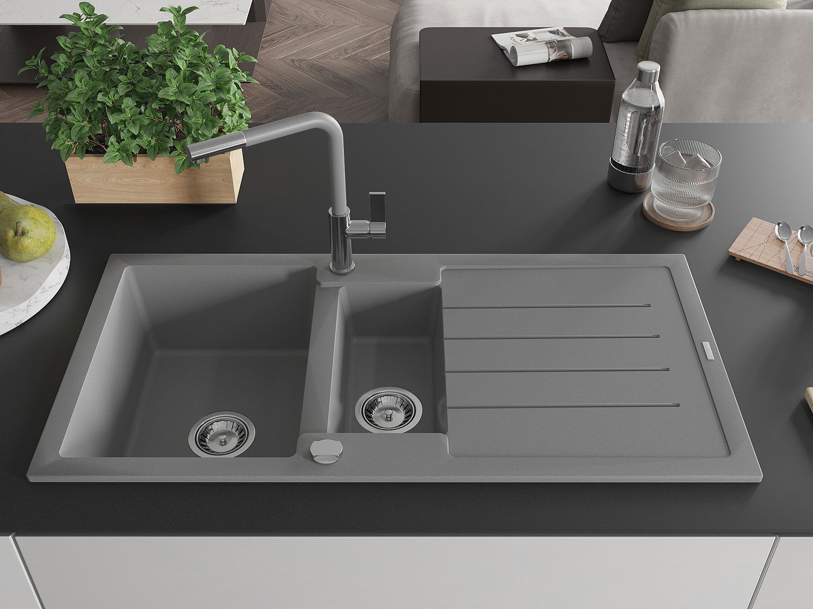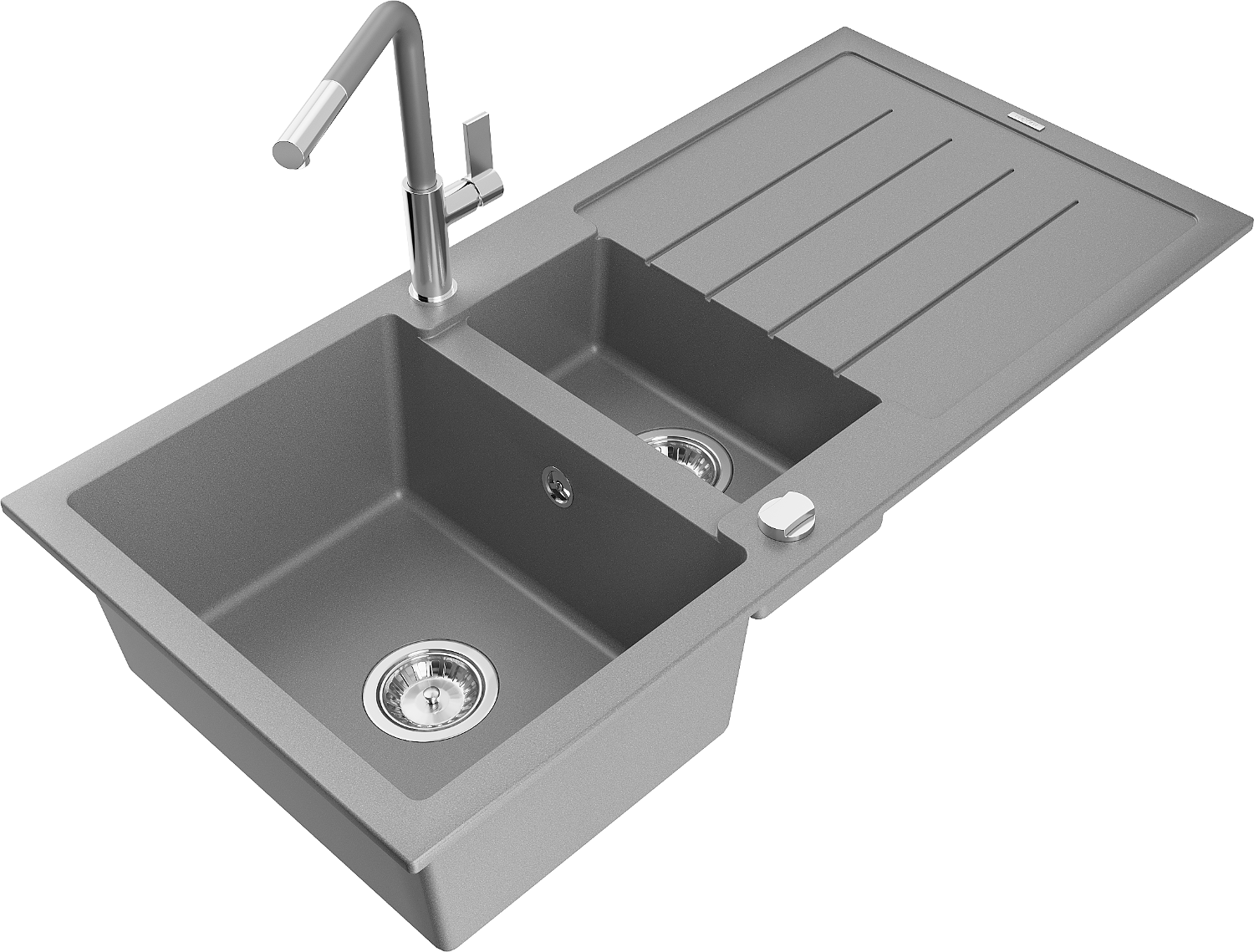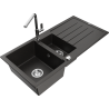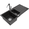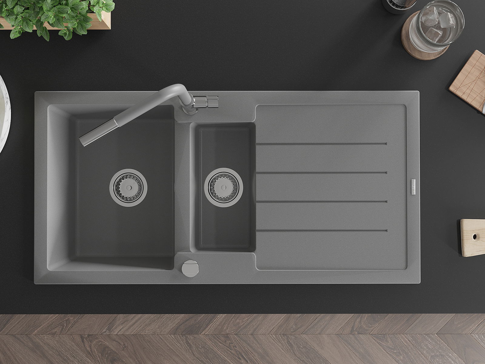 Mexen Andres žulový drez 1,5-komorový s odkvapkávačom a kuchynskou batériou Flora, sivý - 6515-71-670401-06