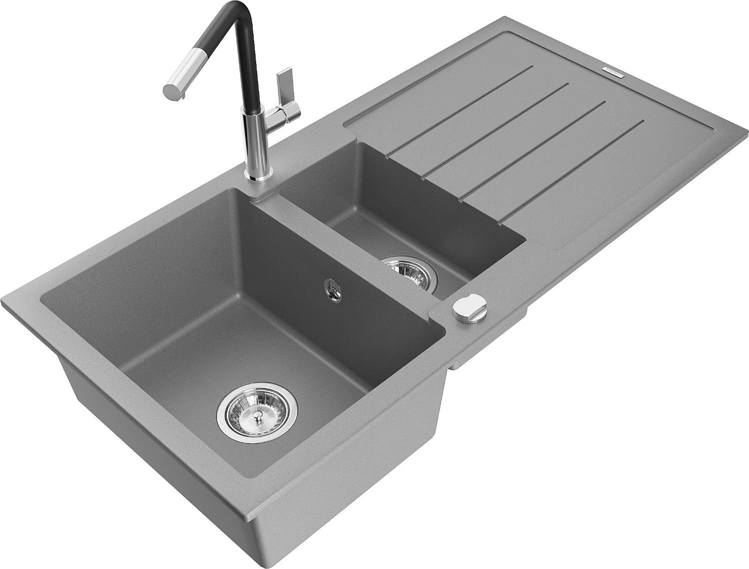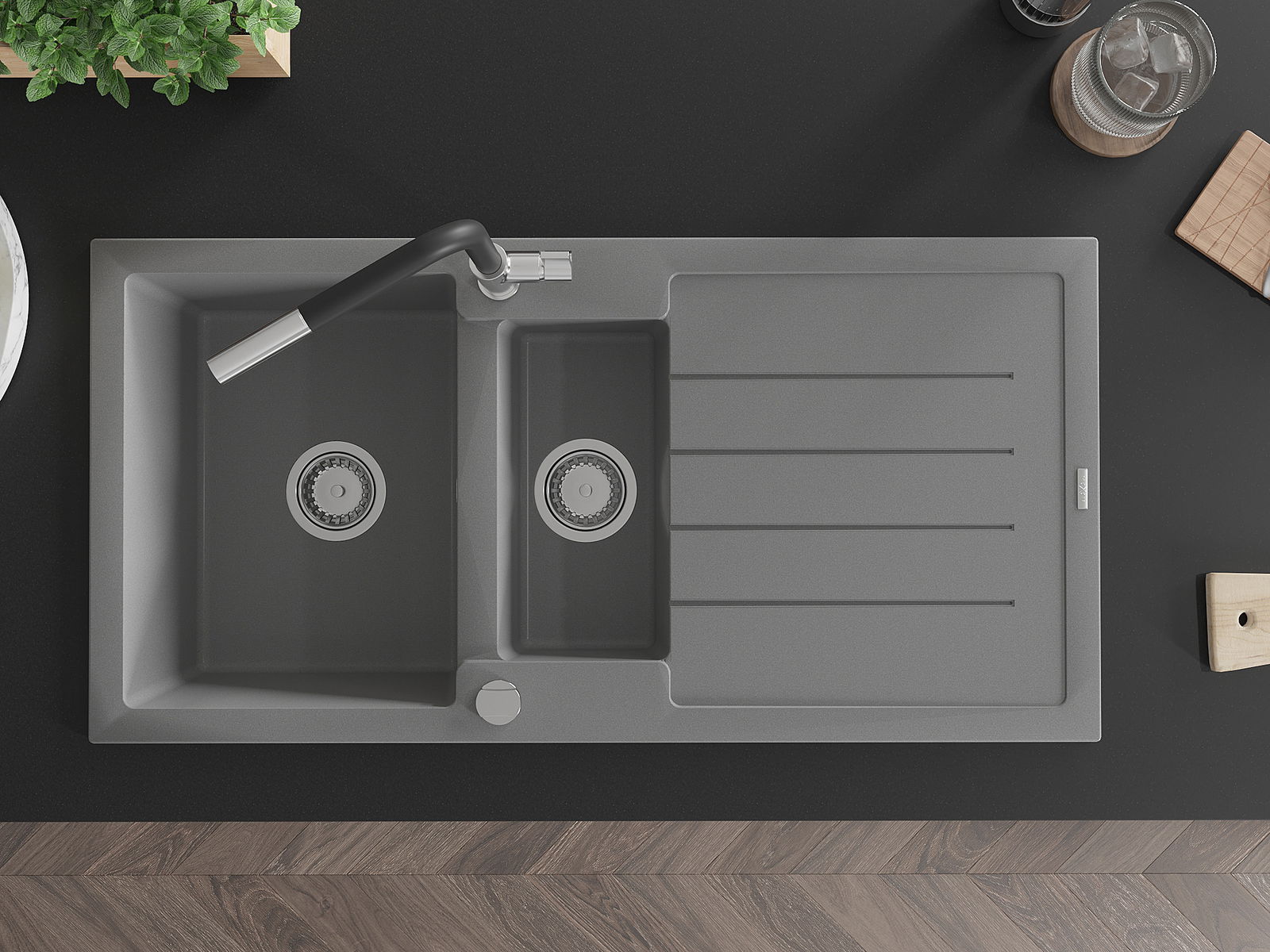 Mexen Andres granitový drez 1,5-komorový s odkvapkávačom a kuchynskou batériou Flora, sivý - 6515-71-670401-07