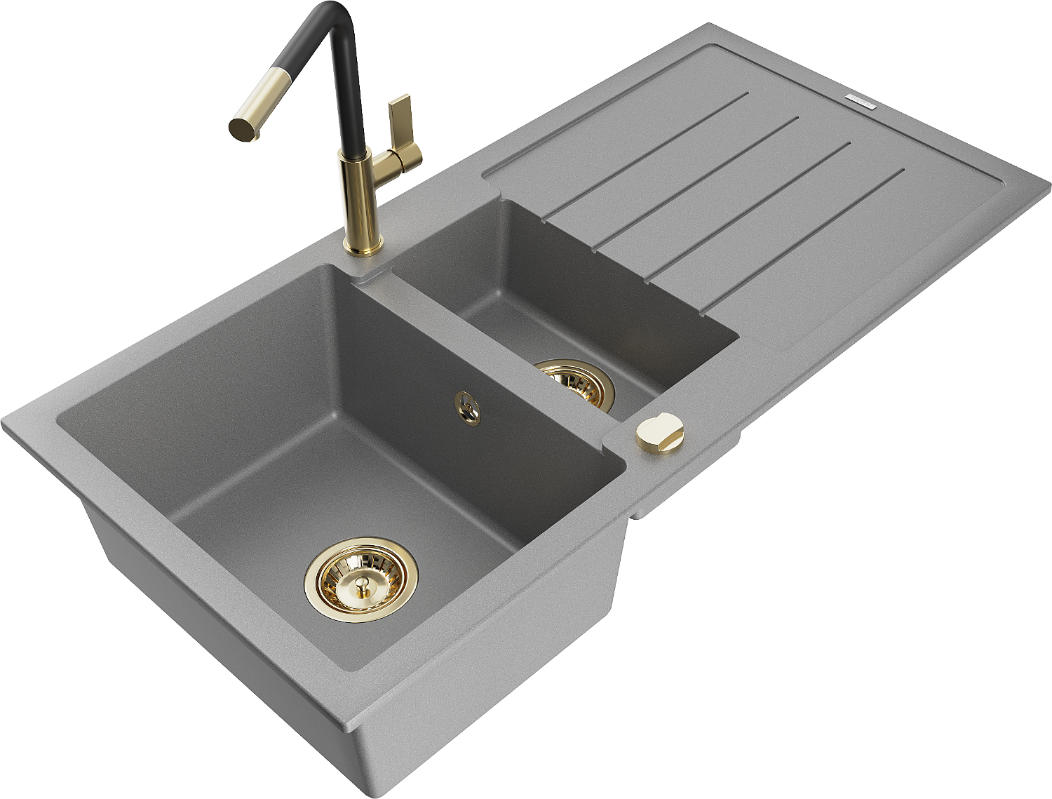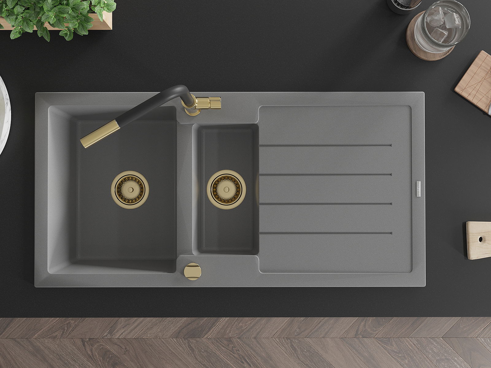 Mexen Andres žulový drez 1,5-komorový s odkvapkávacou plochou a kuchynskou batériou Flora, sivý - 6515-71-670401-57-G