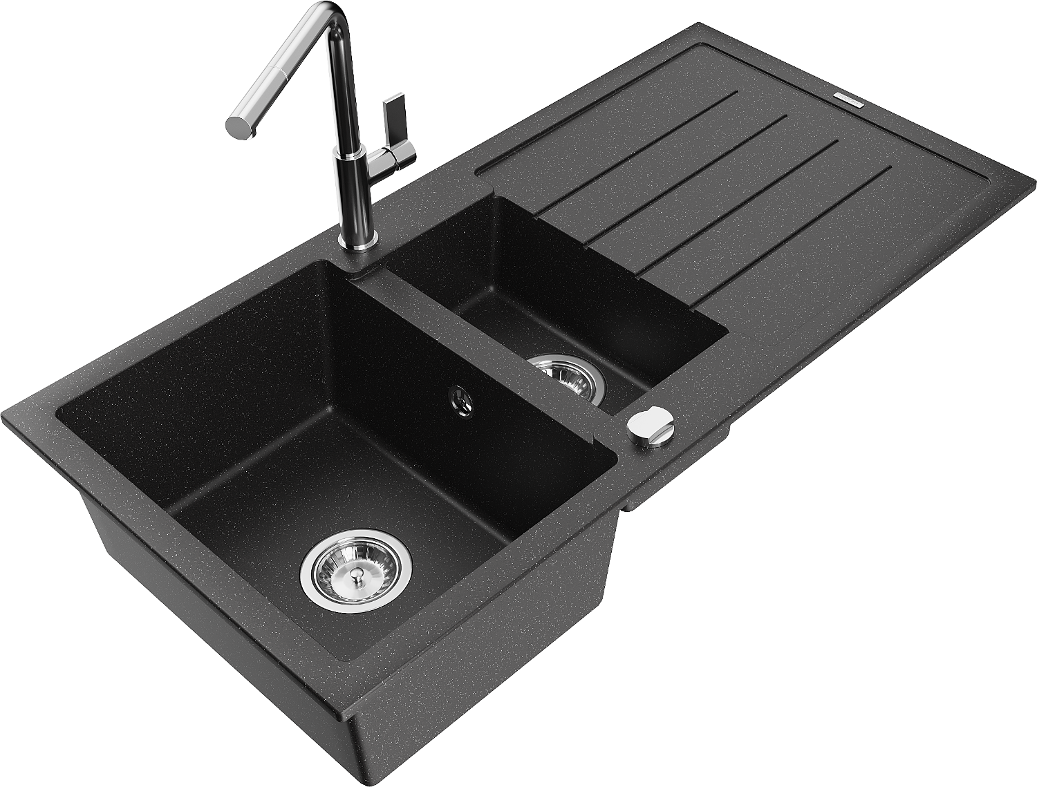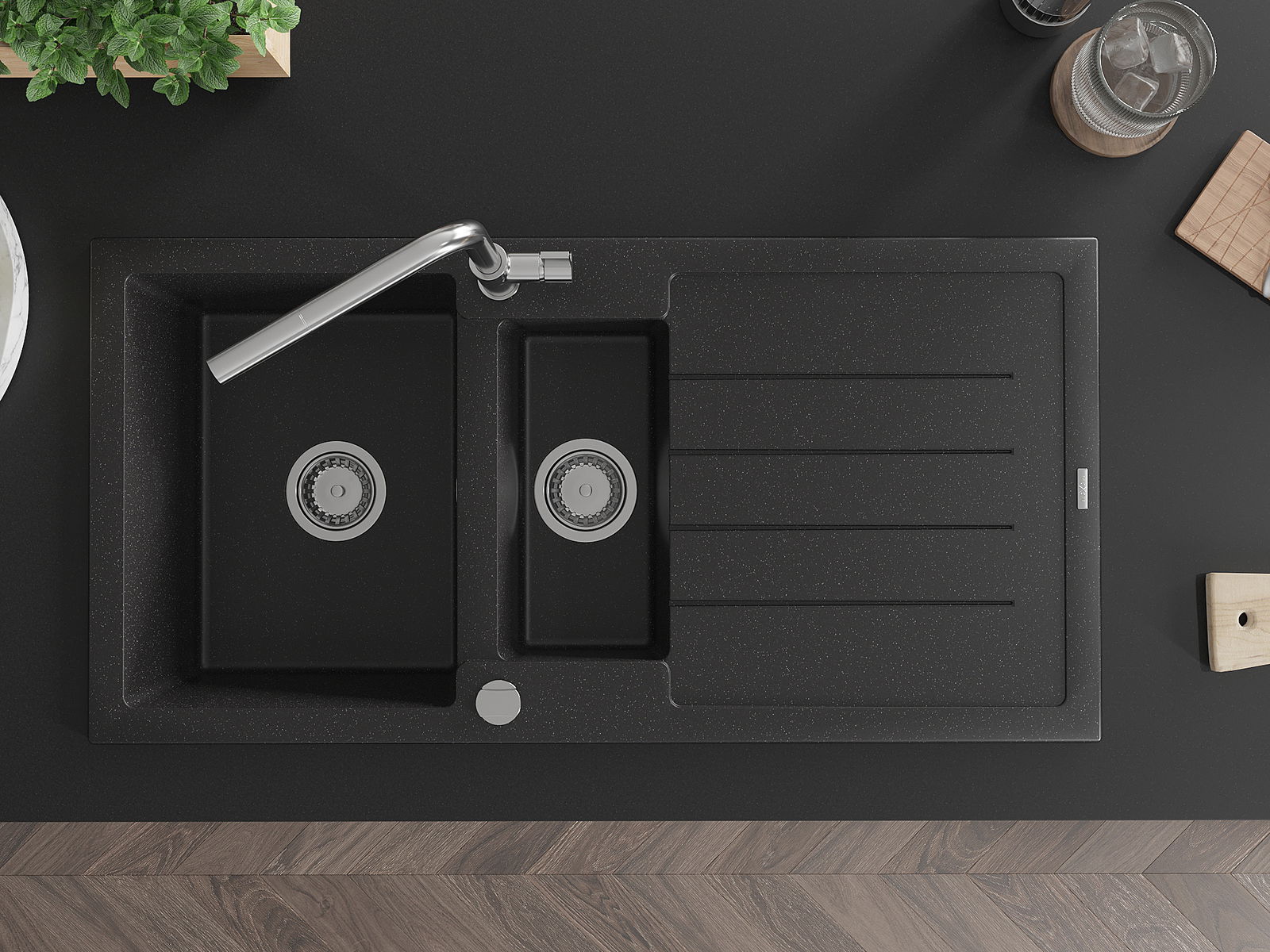 Mexen Andres žulový drez s 1,5 komorou s odkvapkávačom a kuchynskou batériou Flora, čierny/strieborný - 6515-73-670401-00