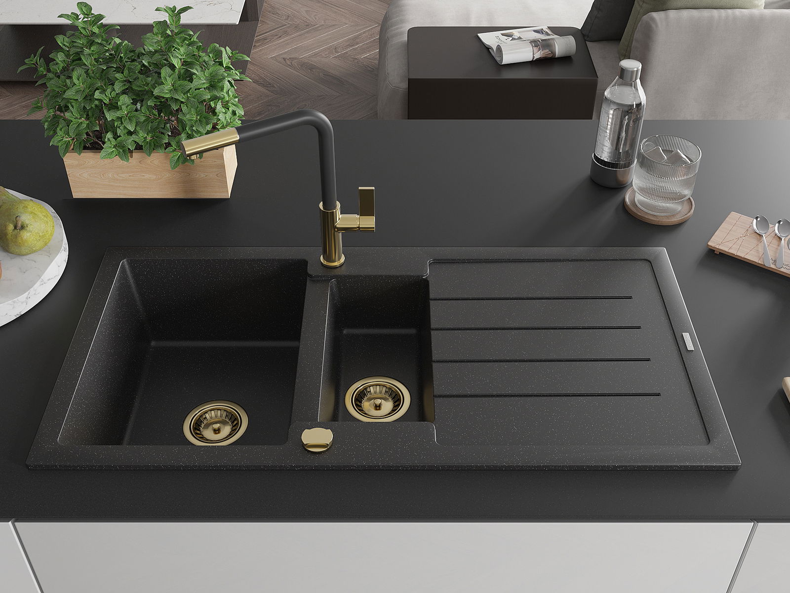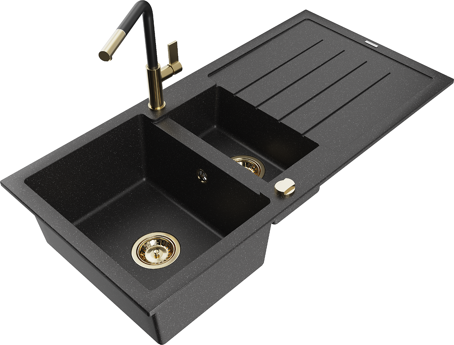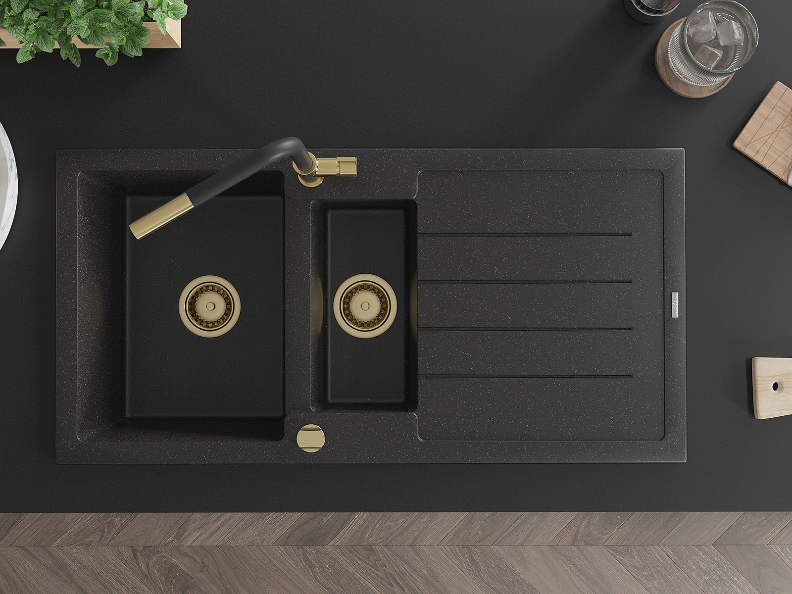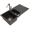 Mexen Andres granitový drez s 1,5 komorou, odkvapkávačom a kuchynskou batériou Flora, čierny/strieborný