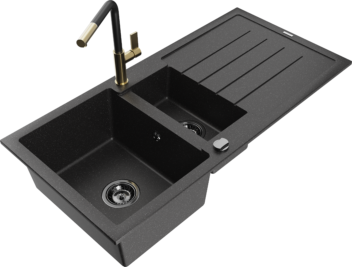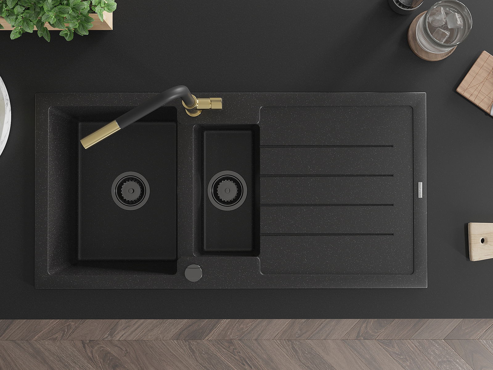 Mexen Andres žulový drez 1,5-komorový s odkvapkávačom a kuchynskou batériou Flora, čierny/strieborný - 6515-73-670401-57-B