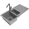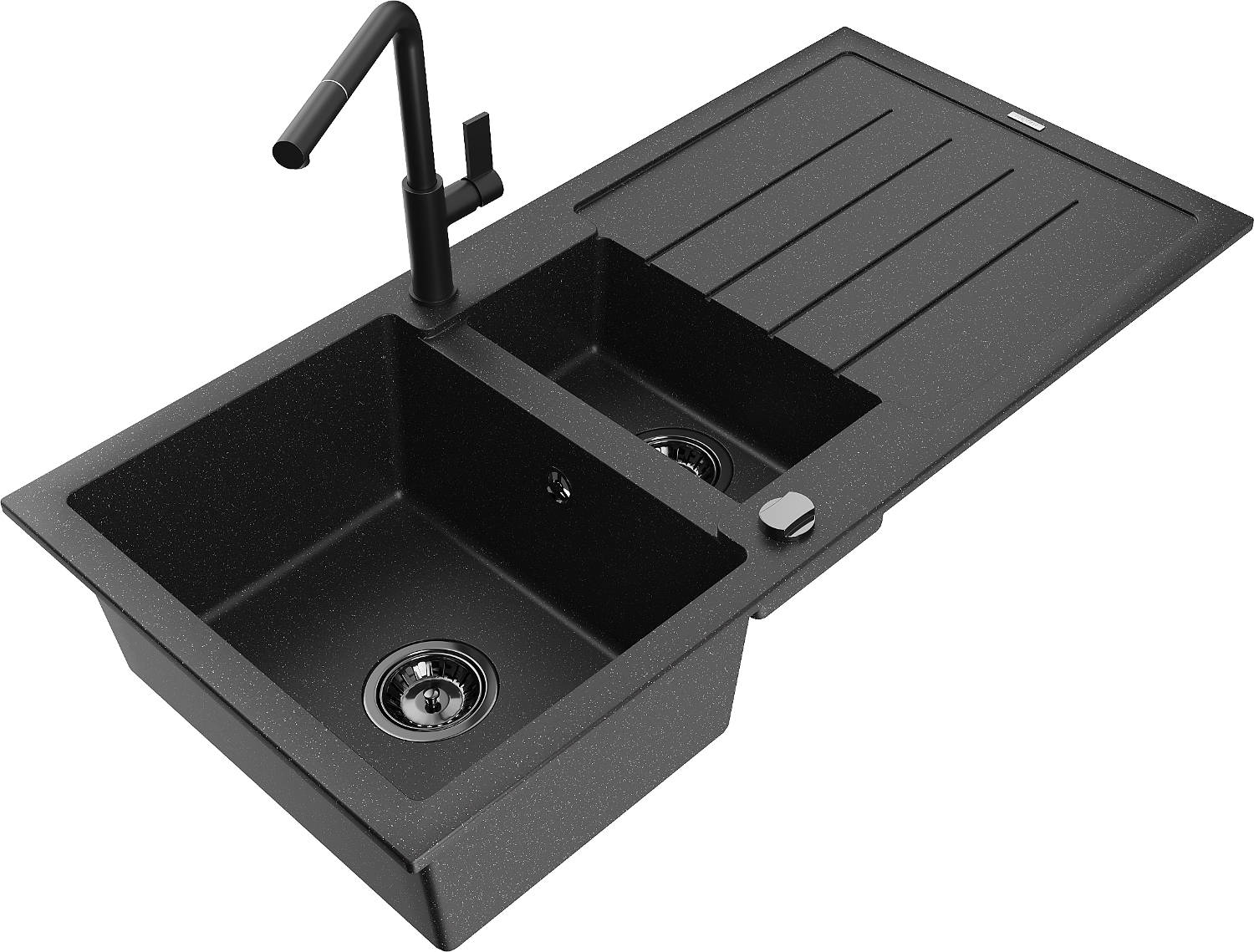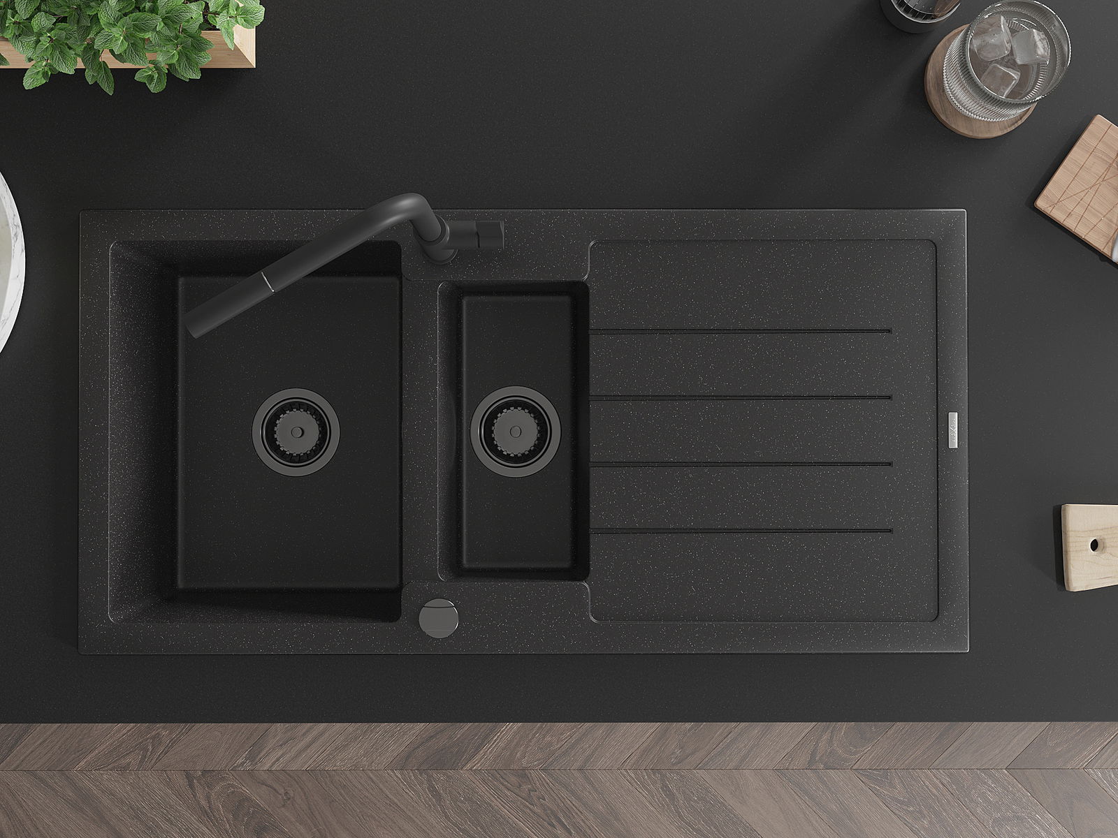 Mexen Andres granitový kuchynský drez 1,5-komorový s odkvapkávačom a kuchynskou batériou Flora, čierno/strieborný