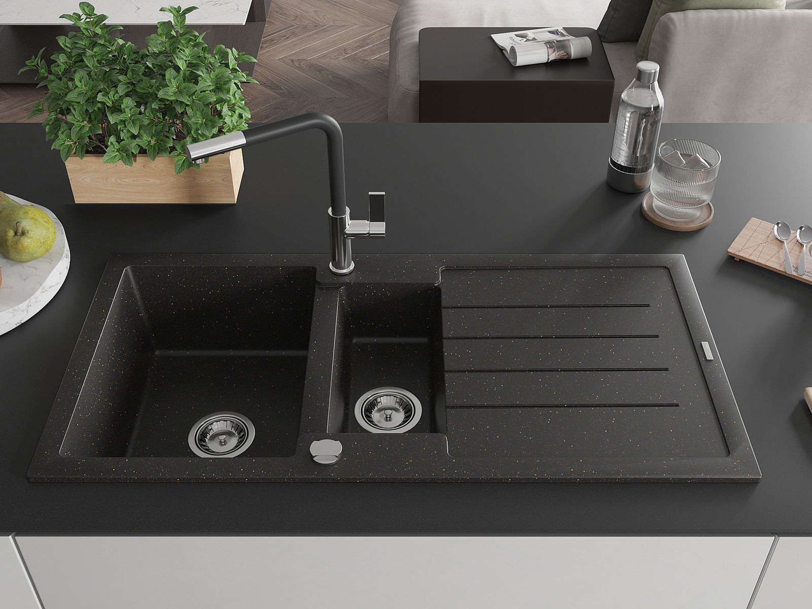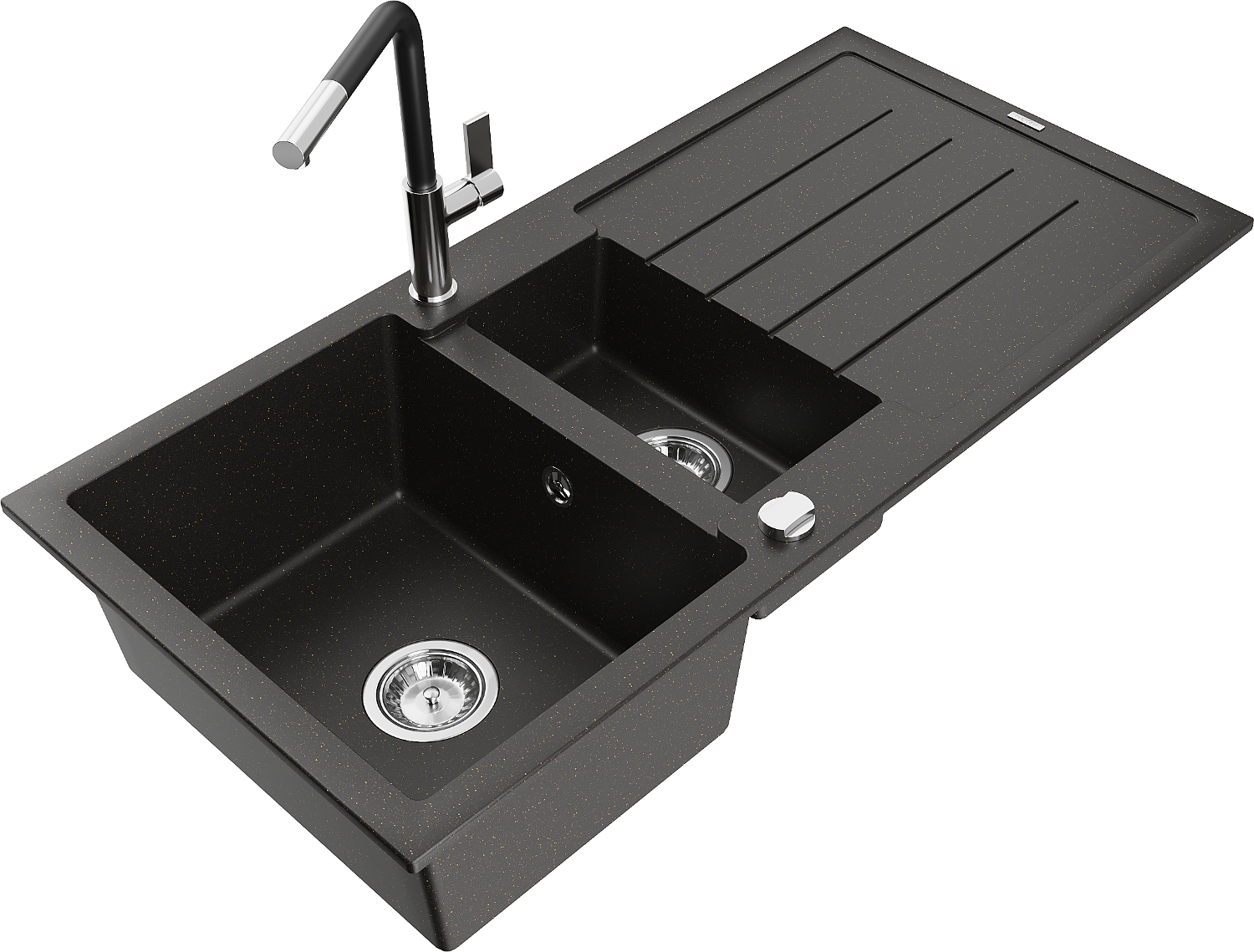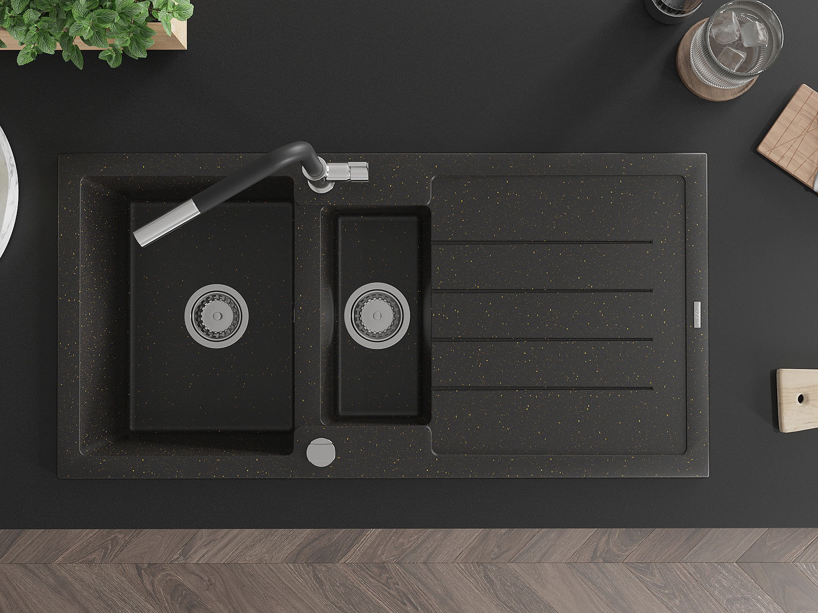 Mexen Andres granitový drez s 1,5 komorou, s odkvapkávačom a kuchynskou batériou Flora, čierny/zlatý metalík