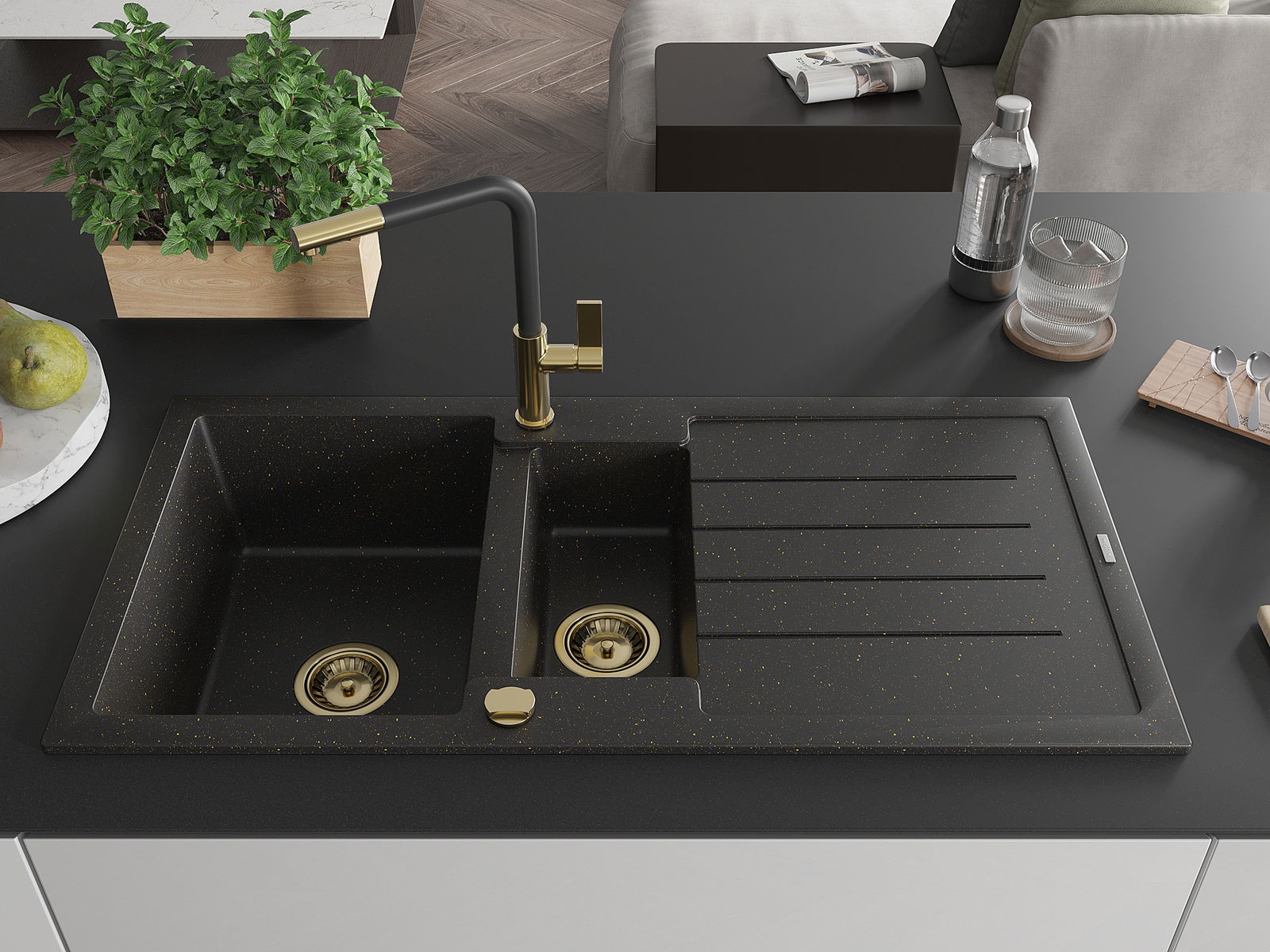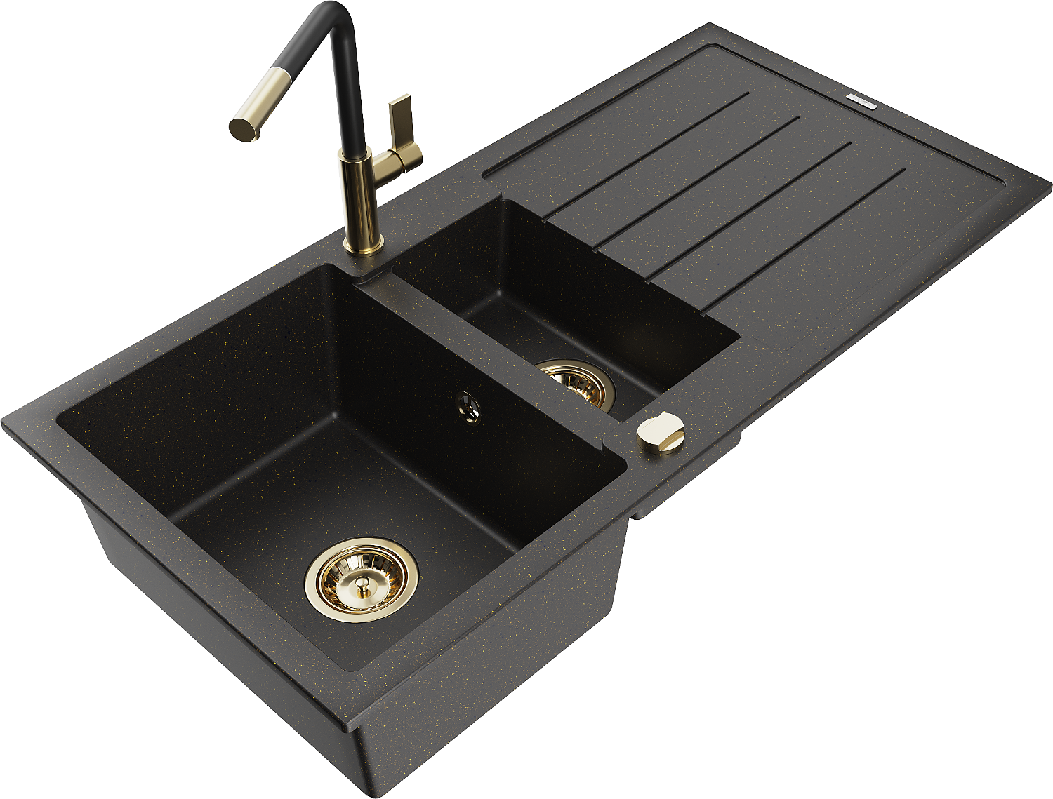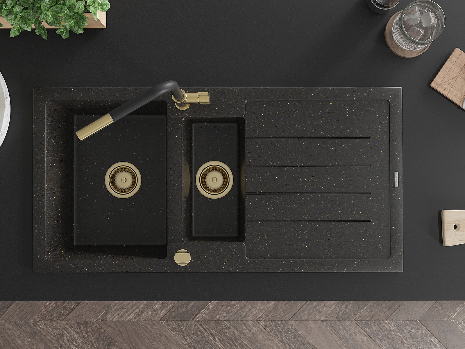 Mexen Andres žulový kuchynský drez 1,5-komorový s odkvapkávačom a kuchynskou batériou Flora, čierny/zlatý - 6515-75-670401-57-G