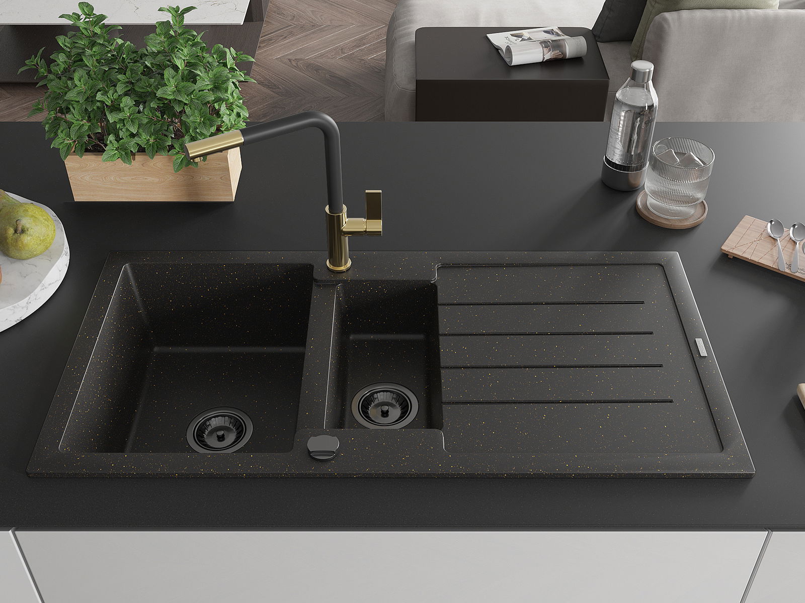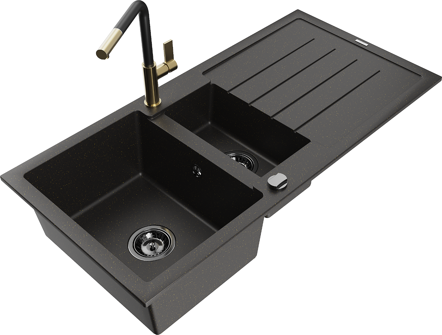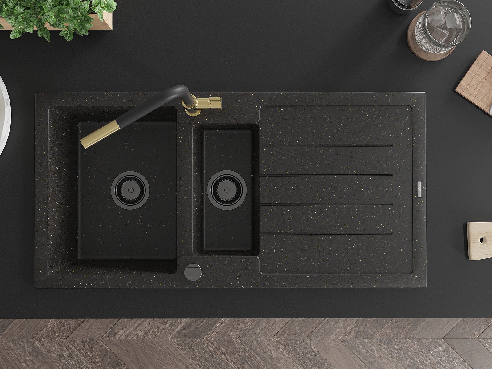 Mexen Andres granitový drez 1,5-komorový s odkvapkávačom a kuchynskou batériou Flora, čierny/zlatý - 6515-75-670401-57-B