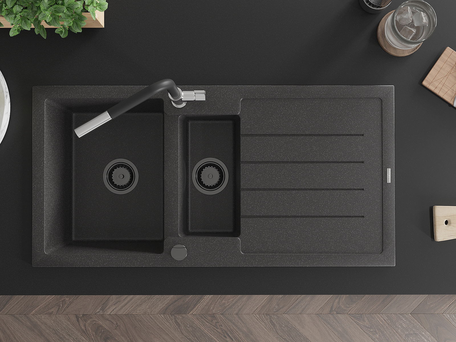 Mexen Andres granitový drez 1,5-komorový s odkvapkávačom a kuchynskou batériou Flora, čierny škvrnitý - 6515-76-670401-07-B