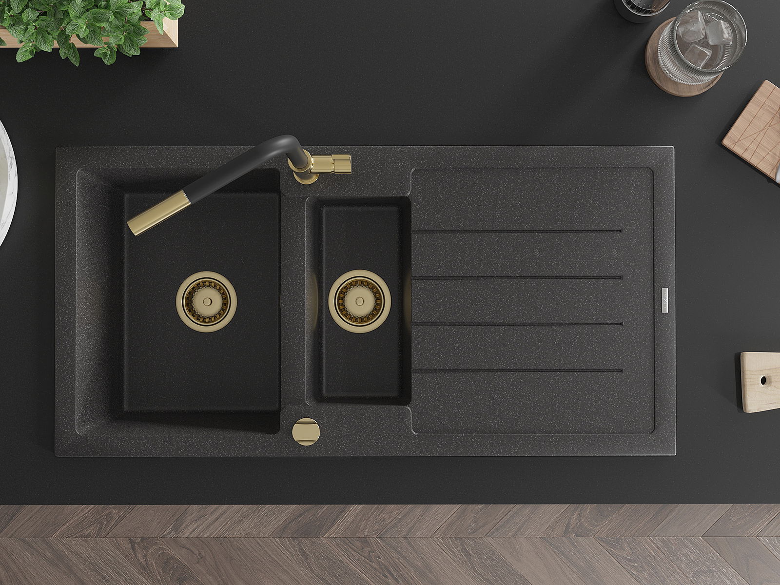 Mexen Andres granitový drez 1,5-komorový s odkvapkávačom a kuchynskou batériou Flora, čierna škvrnitá - 6515-76-670401-57-G