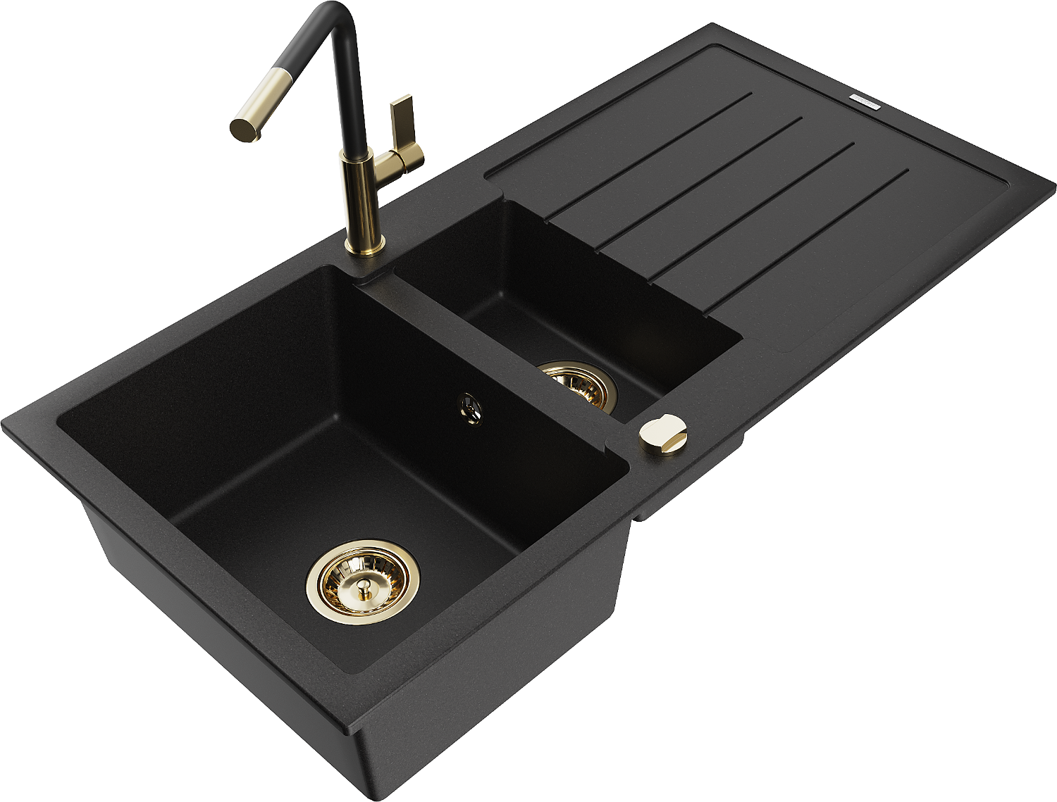 Mexen Andres granitový kuchynský drez 1,5-komorový s odkvapkávačom a kuchynskou batériou Flora, čierny - 6515-77-670401-57-G