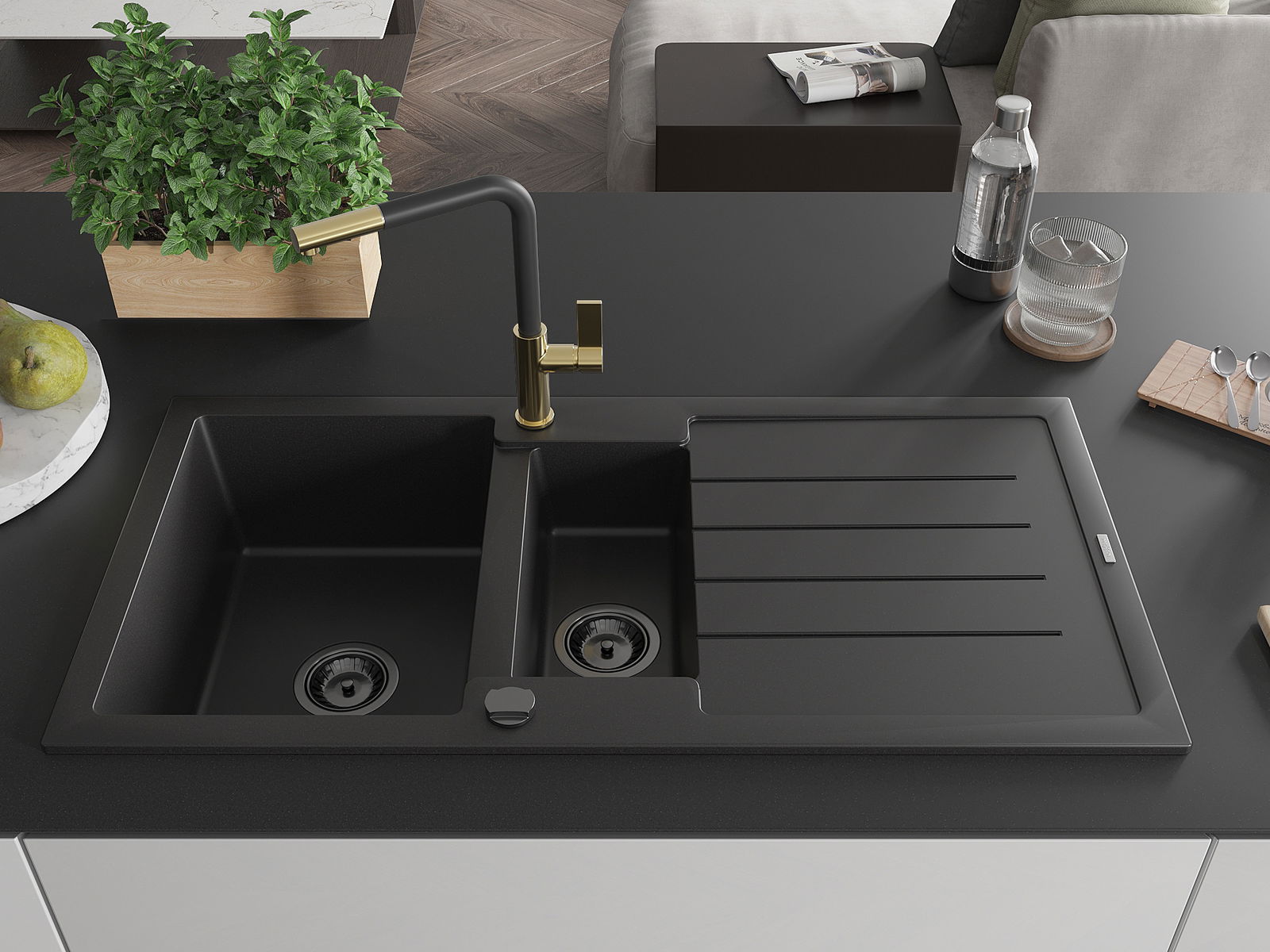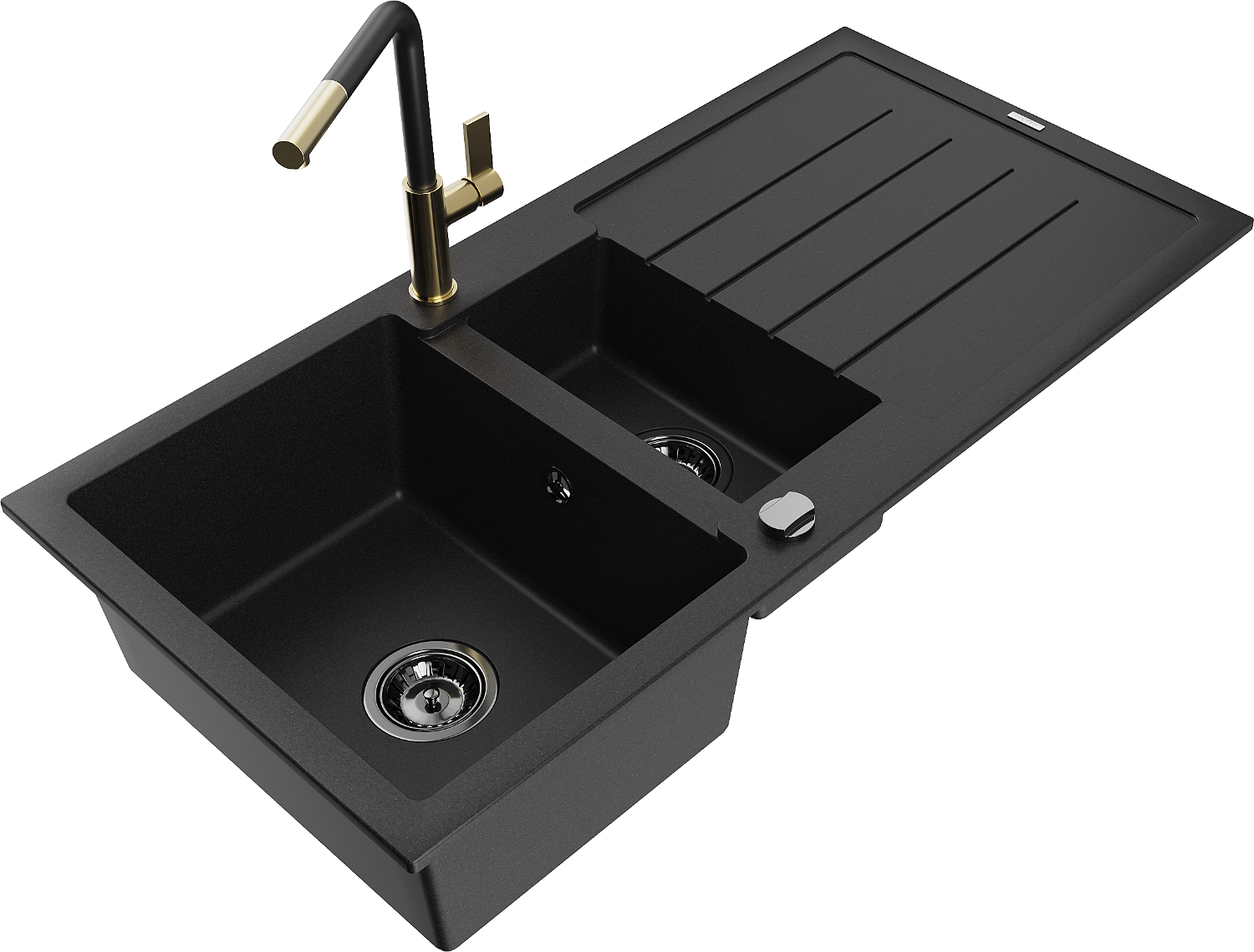 Mexen Andres žulový kuchynský drez 1,5-komorový s odkvapkávačom a kuchynskou batériou Flora, čierny - 6515-77-670401-57-B