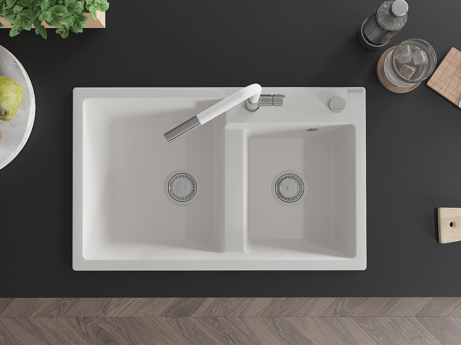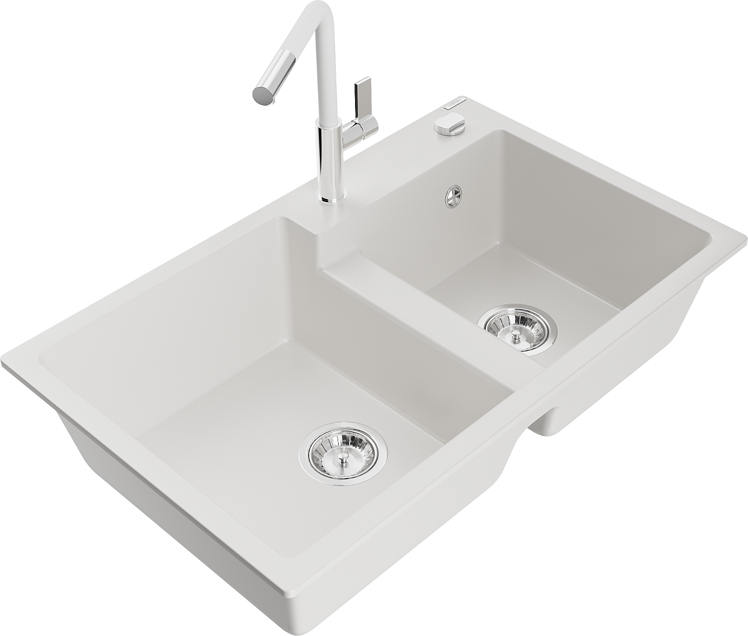 Mexen Tomas žulový drez 2-komorový s kuchynskou batériou Flora, biely - 6516-20-670401-02