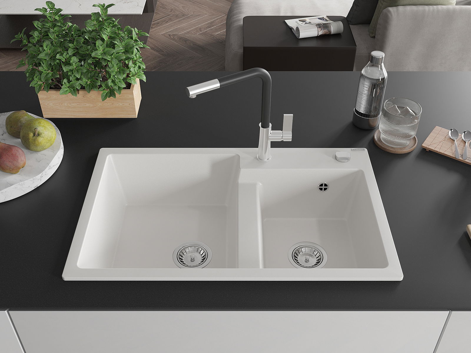 Povrch umývadla je odolný voči škvrnám a sfarbeniu, vďaka čomu sa ľahko čistí a zachováva si svoju farbu po dlhú dobu. Estetický a prakticky dopĺňajúci každú kuchyňu.