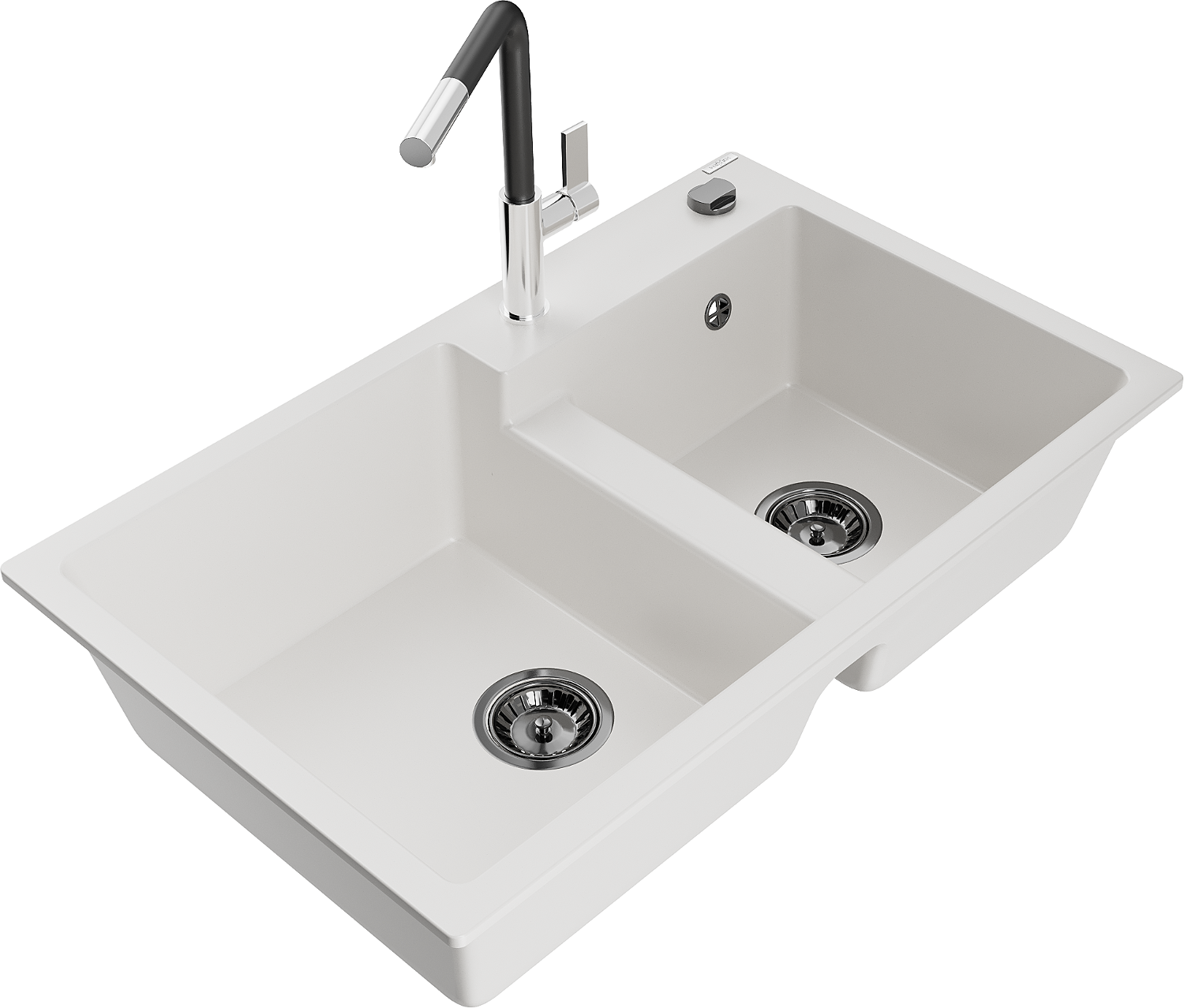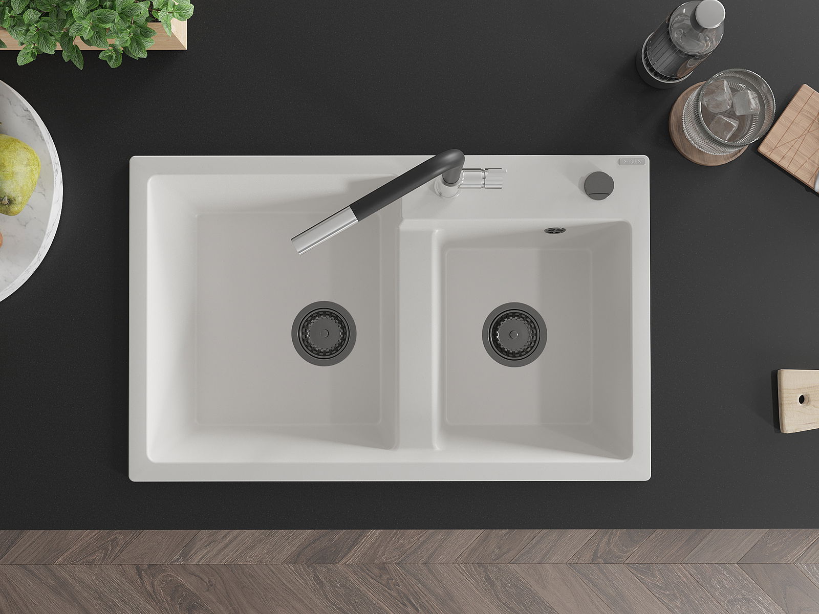 Mexen Tomas granitový drez 2-komorový s kuchynskou batériou Flora, biely - 6516-20-670401-07-B