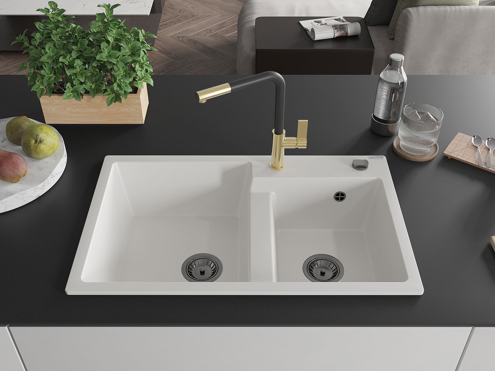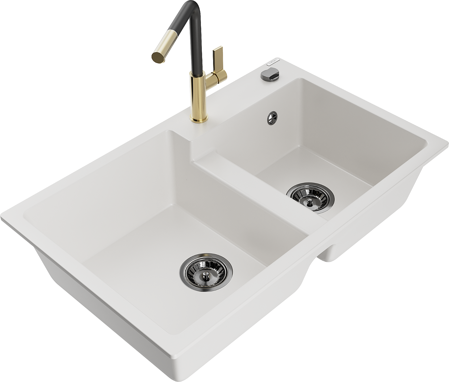 Mexen Tomas žulový drez 2-komorový s kuchynskou batériou Flora, biela - 6516-20-670401-57-B
