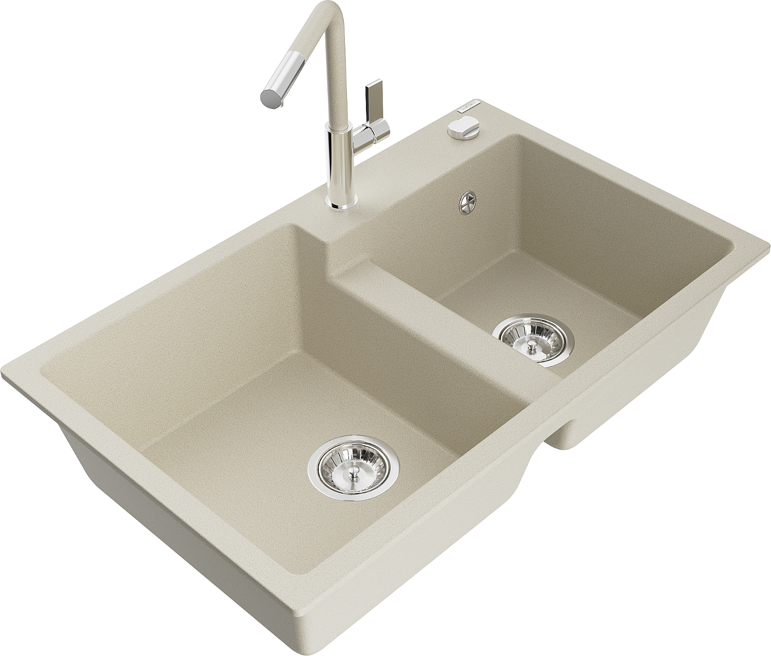 Mexen Tomas granitový kuchynský drez 2-komorový s kuchynskou batériou Flora, béžový - 6516-69-670401-09
