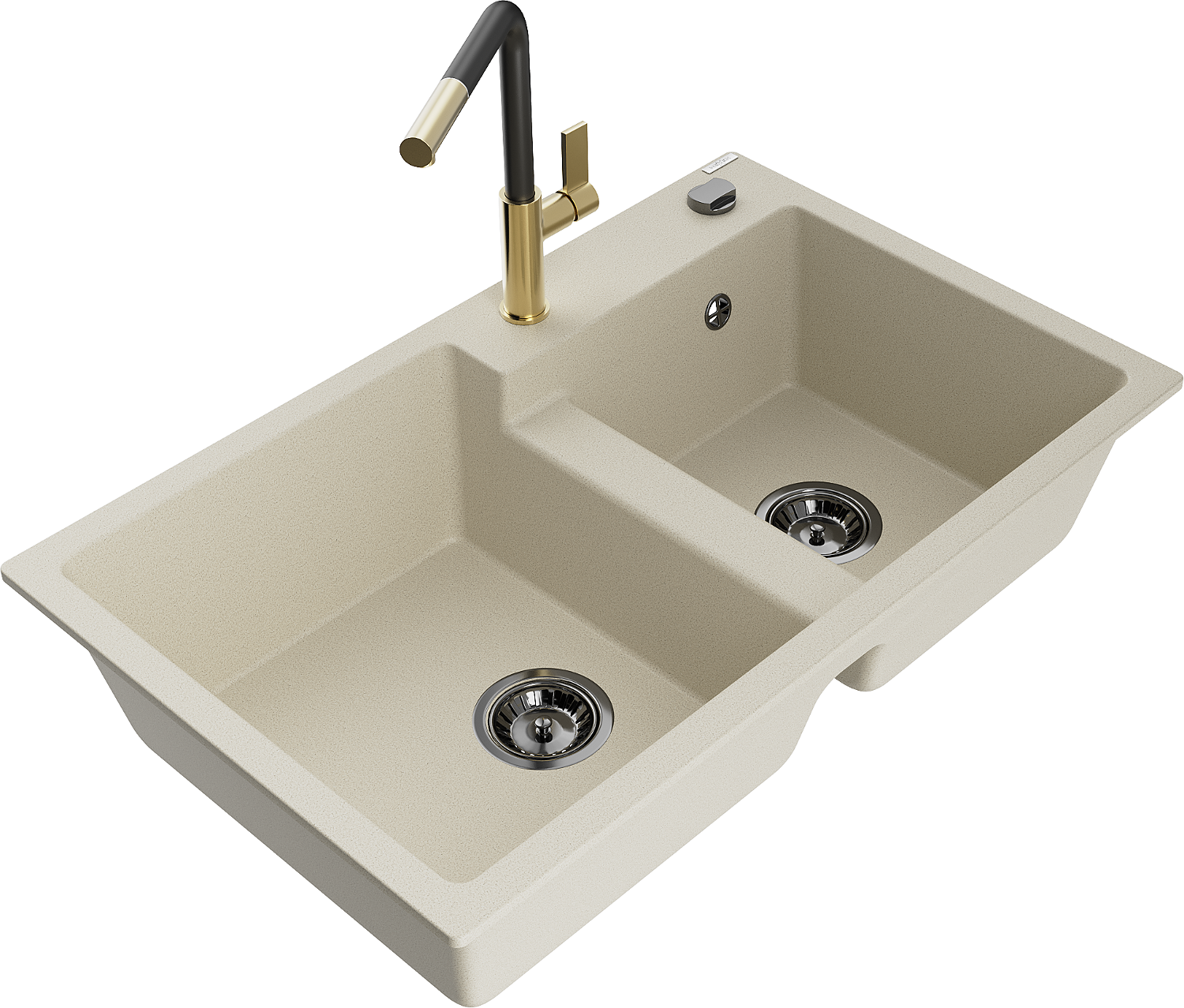 Mexen Tomas granitový drez 2-komorový s kuchynskou batériou Flora, béžový - 6516-69-670401-57-B