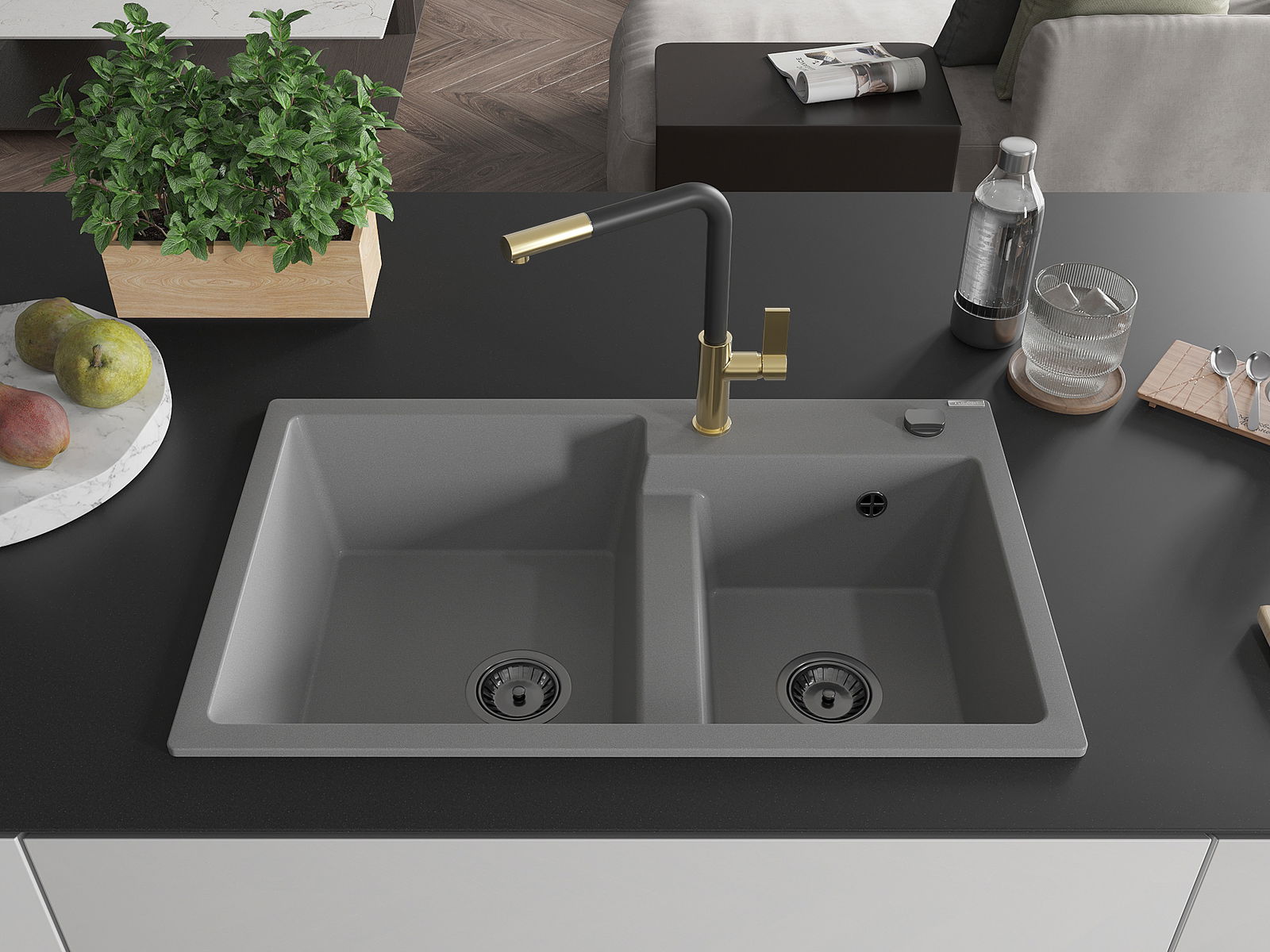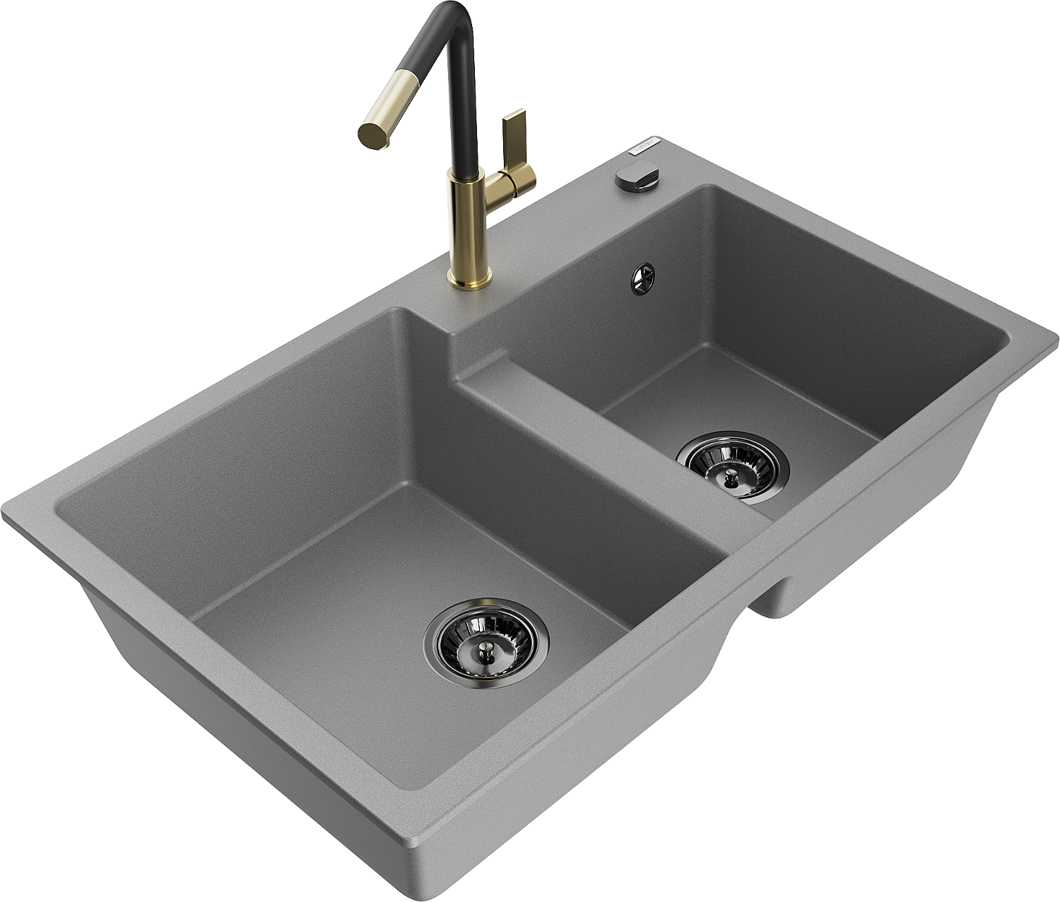 Mexen Tomas granitový drez 2-komorový s kuchynskou batériou Flora, sivý - 6516-71-670401-57-B