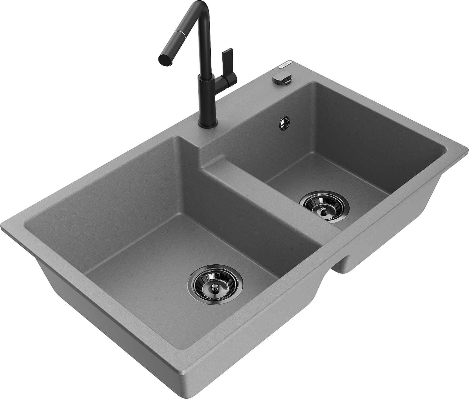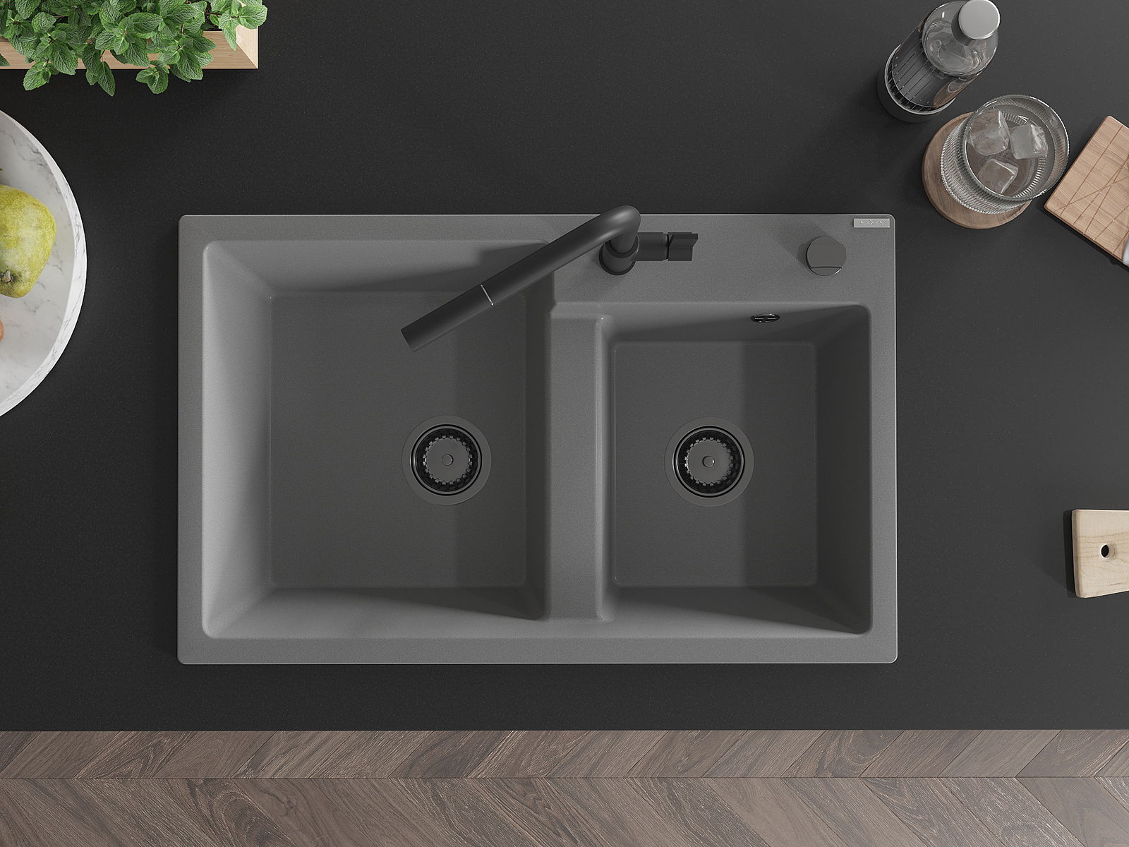 Mexen Tomas žulový drez s dvomi komorami a kuchynská batéria Flora, sivá - 6516-71-670401-70-B