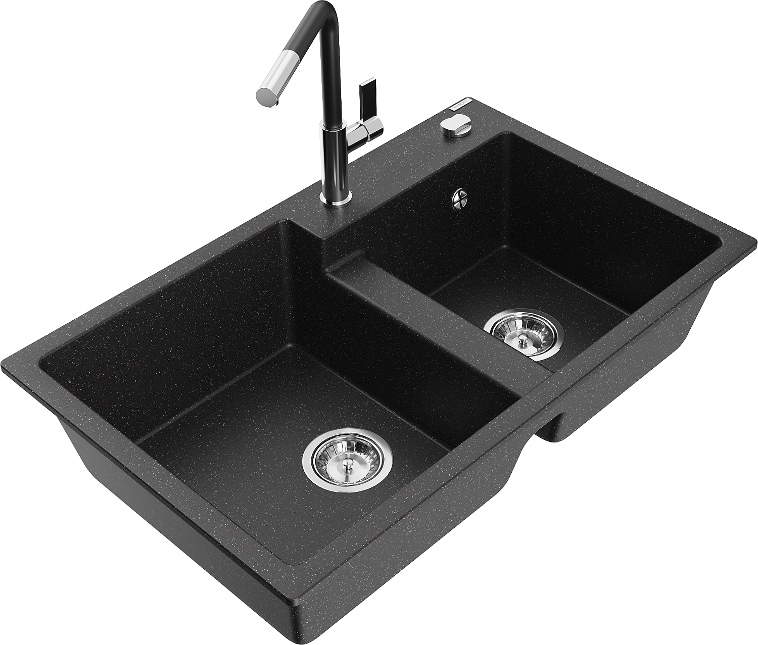 Mexen Tomas žulový drez 2-komorový s kuchynskou batériou Flora, čierny/strieborný metalík - 6516-73-670401-07