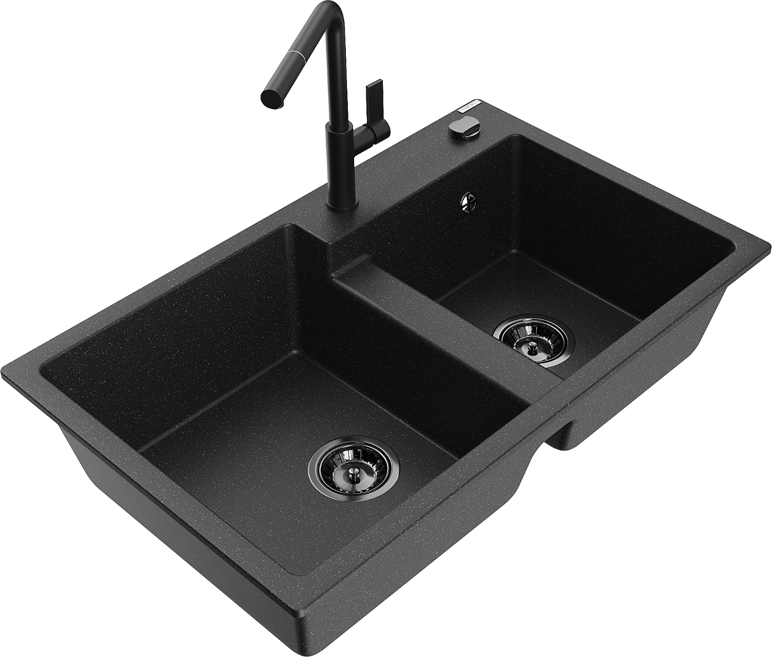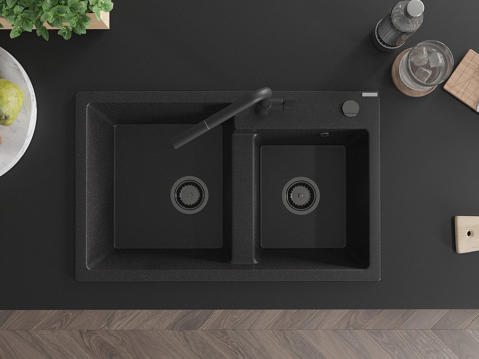 Mexen Tomas žulový kuchynský drez 2-komorový s kuchynskou batériou Flora, čierny/strieborný metalický - 6516-73-670401-70-B