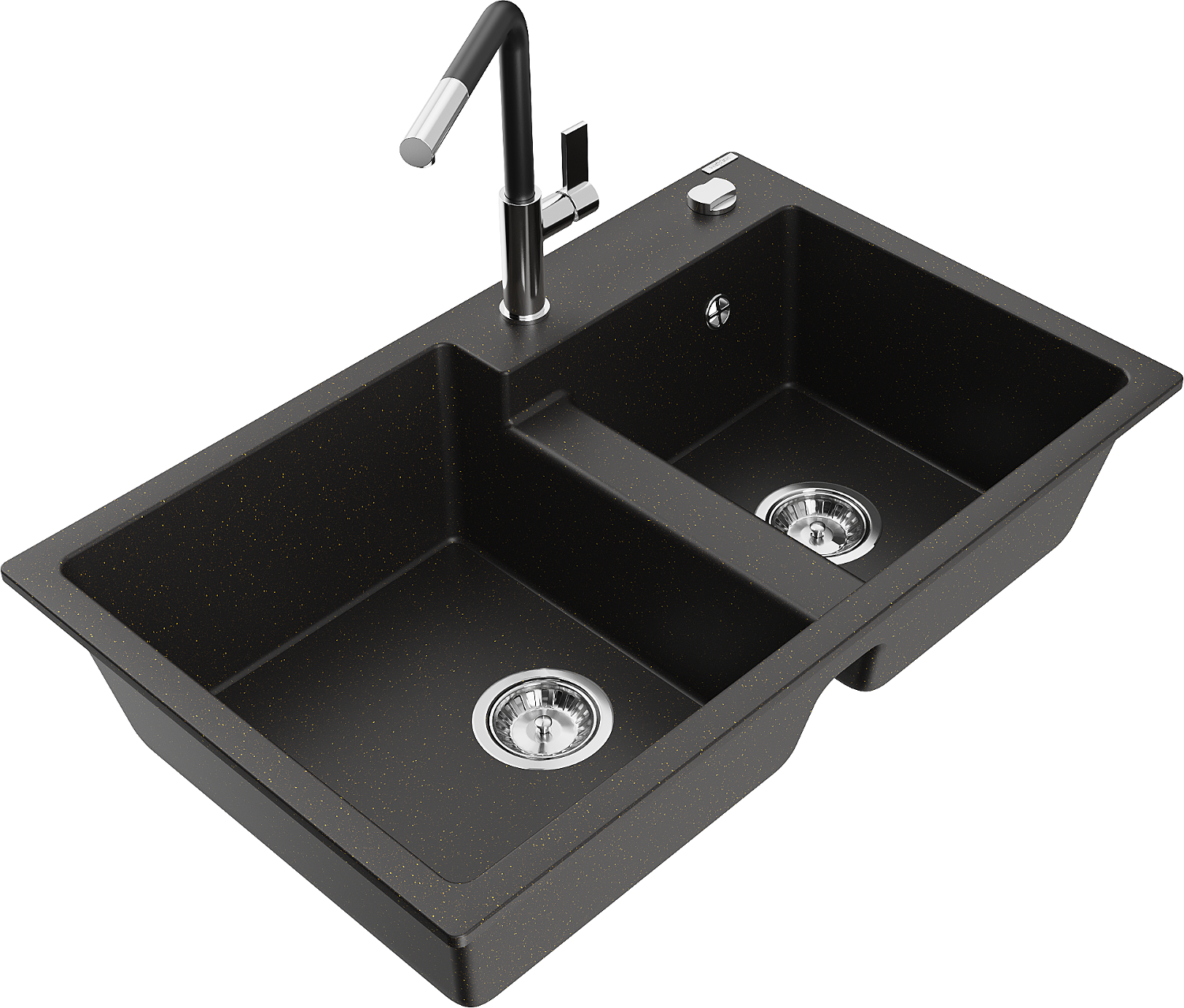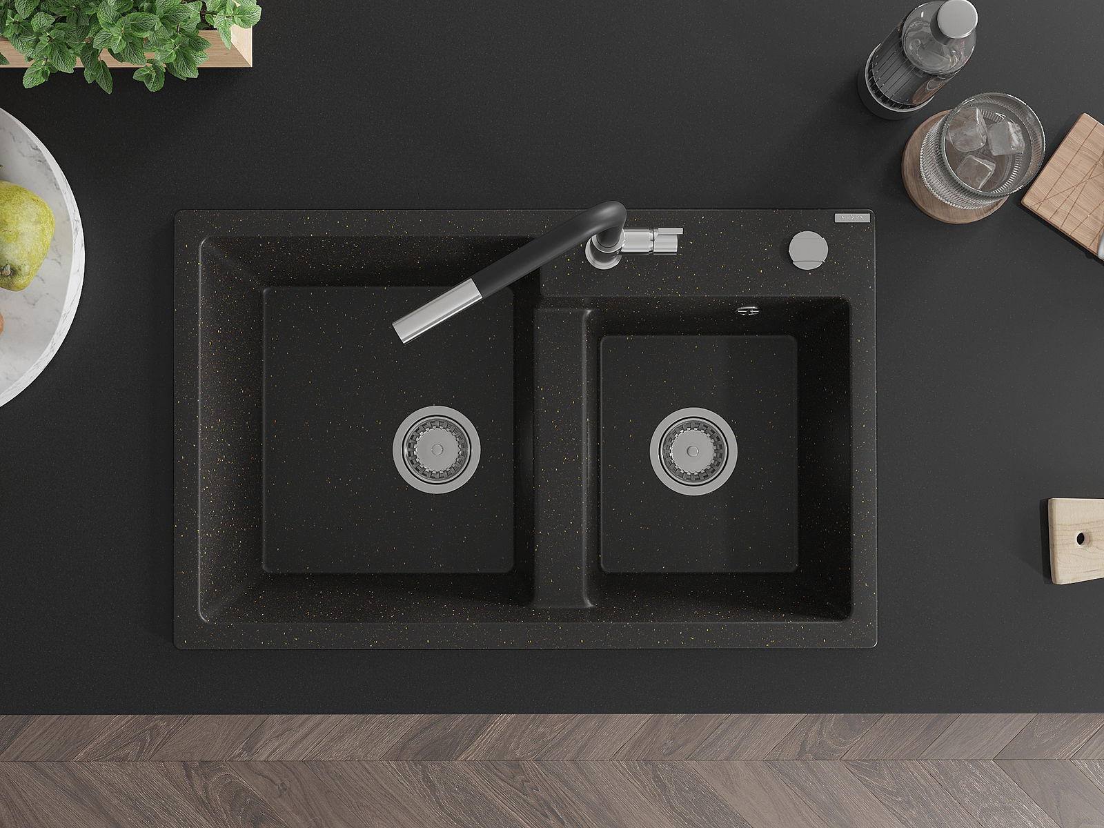 Mexen Tomas granitový drez 2-komorový s kuchynskou batériou Flora, čierny/zlatý metalík - 6516-75-670401-07