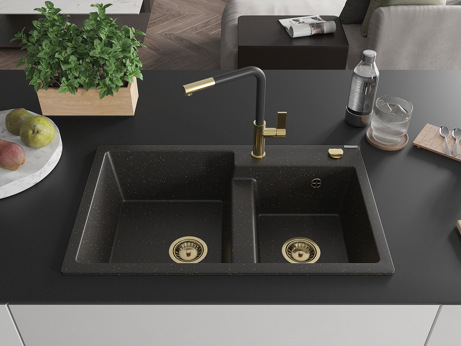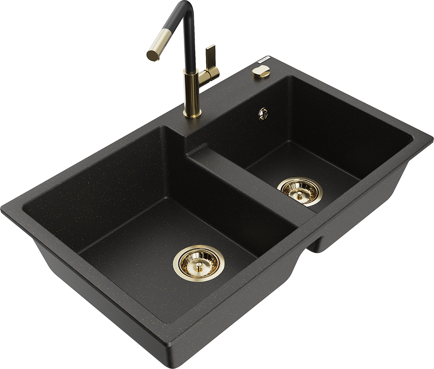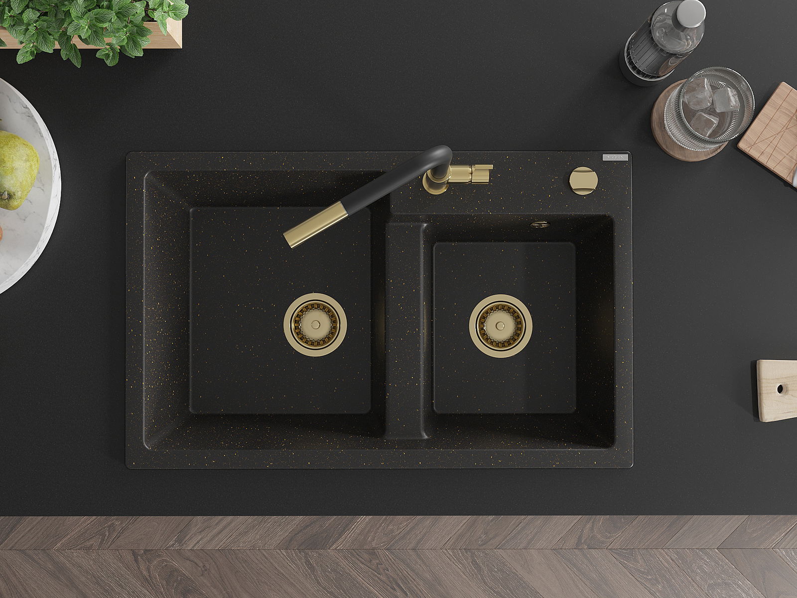 Mexen Tomas žulový drez dvojkomorový s kuchynskou batériou Flora, čierny/zlatý metalik - 6516-75-670401-57-G