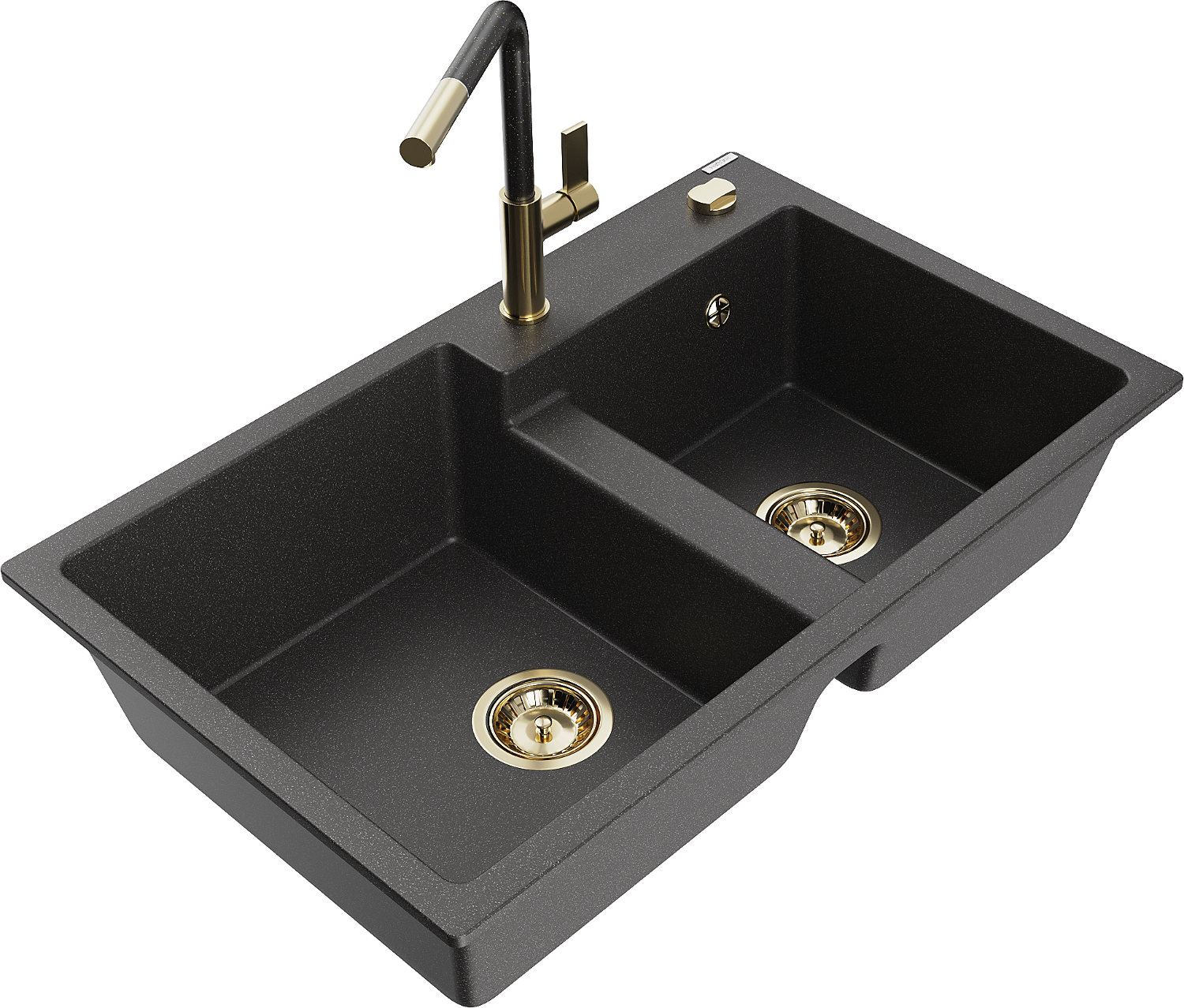 Mexen Tomas žulový drez s 2 komorami s kuchynskou batériou Flora, čierna bodkovaná - 6516-76-670401-75-G