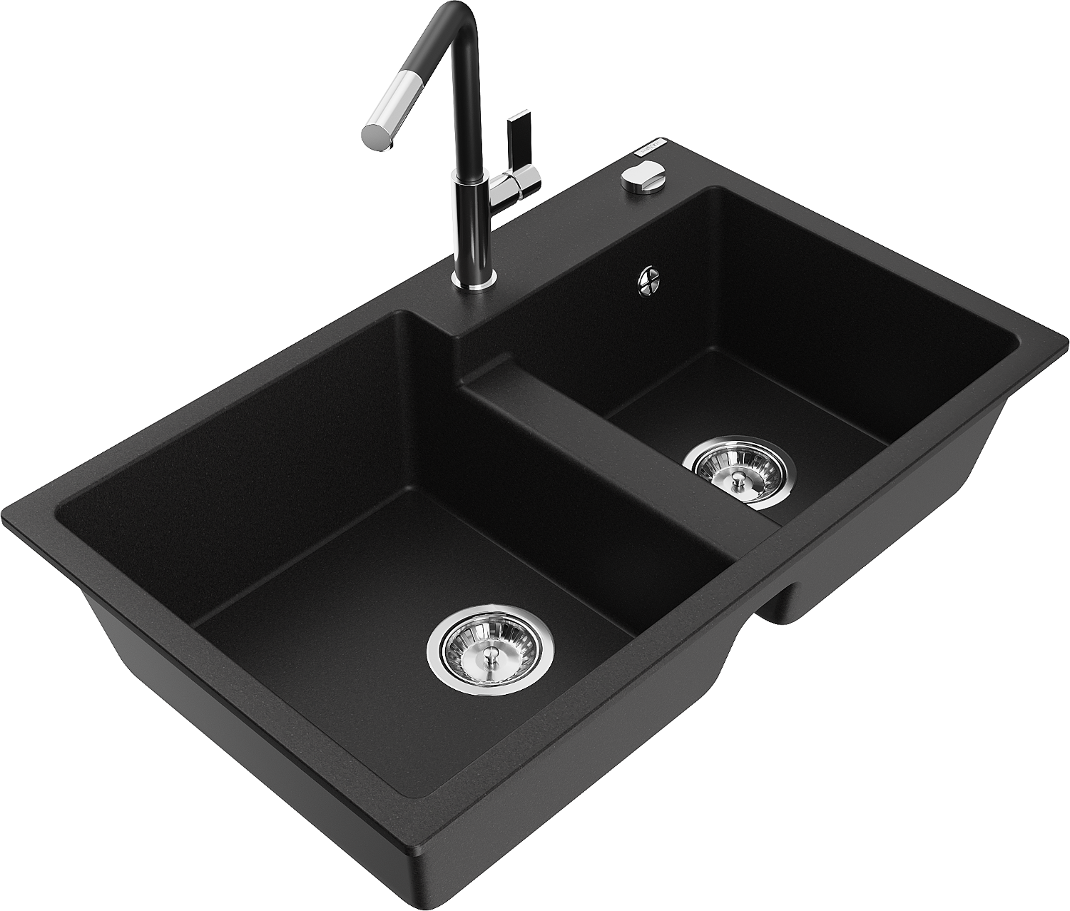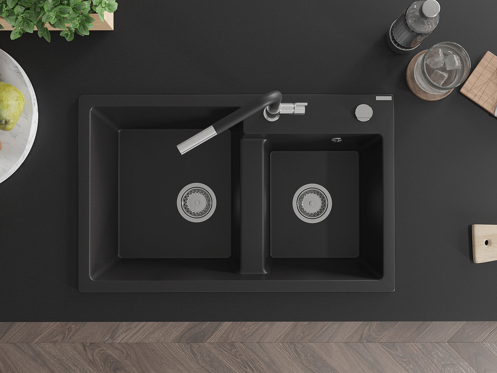 Mexen Tomas žulový drez 2-komorový s kuchynskou batériou Flora, čierny - 6516-77-670401-07
