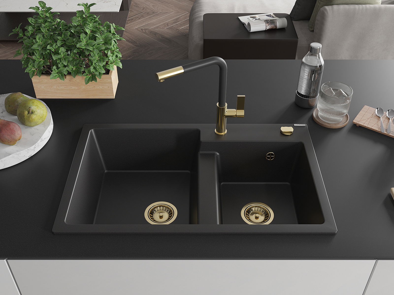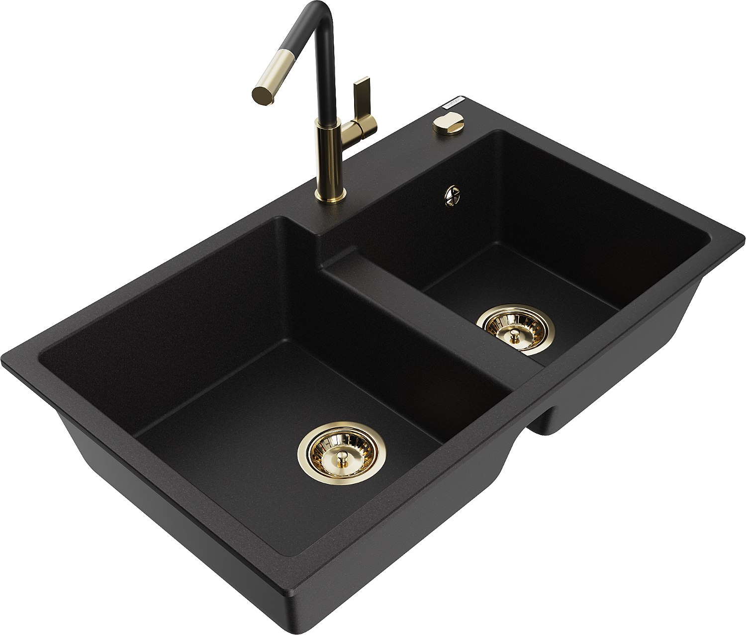 Mexen Tomas žulový drez 2-komorový s kuchynskou batériou Flora, čierny - 6516-77-670401-57-G