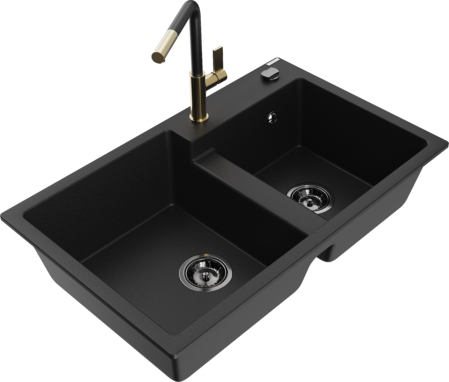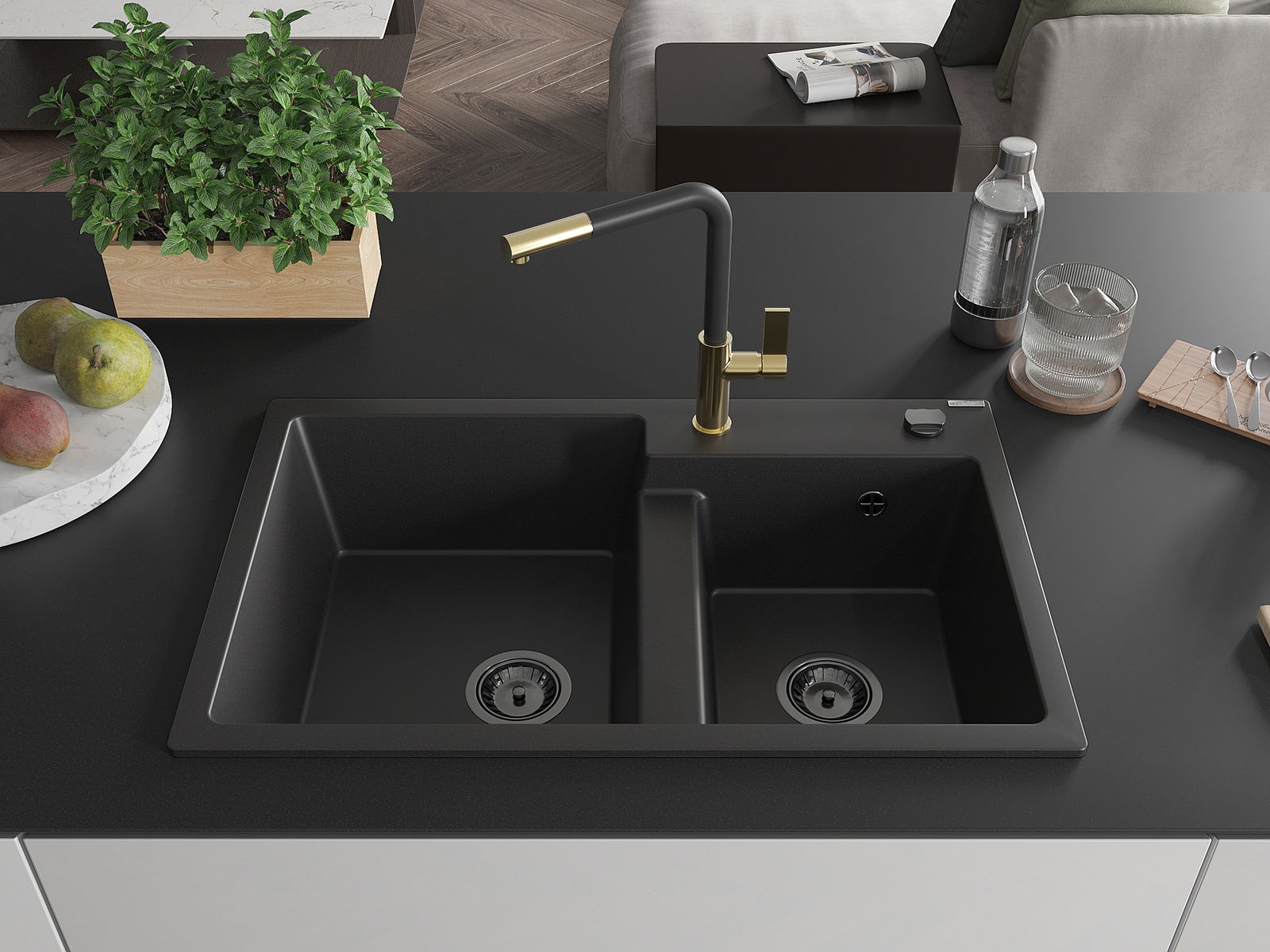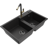 Mexen Tomas dvojkomorový kuchynský drez s kuchynskou batériou Flora, čierny - 6516-77-670401-57-B