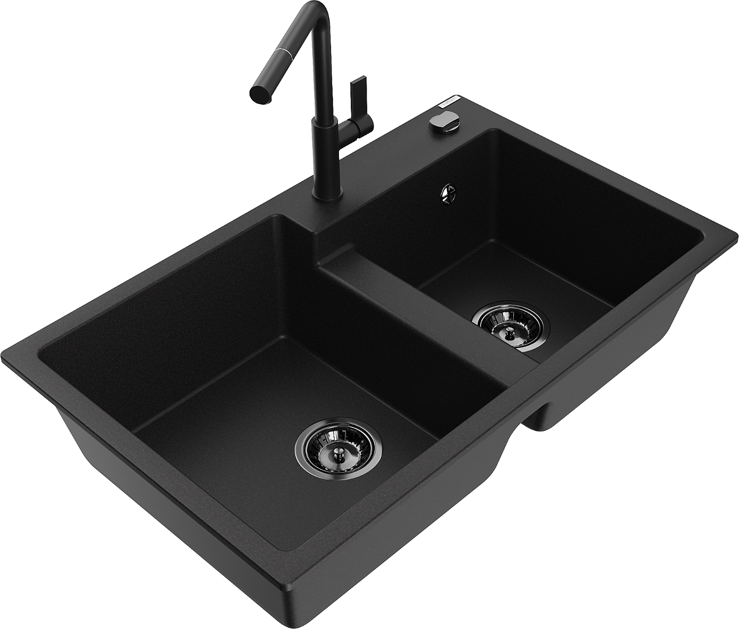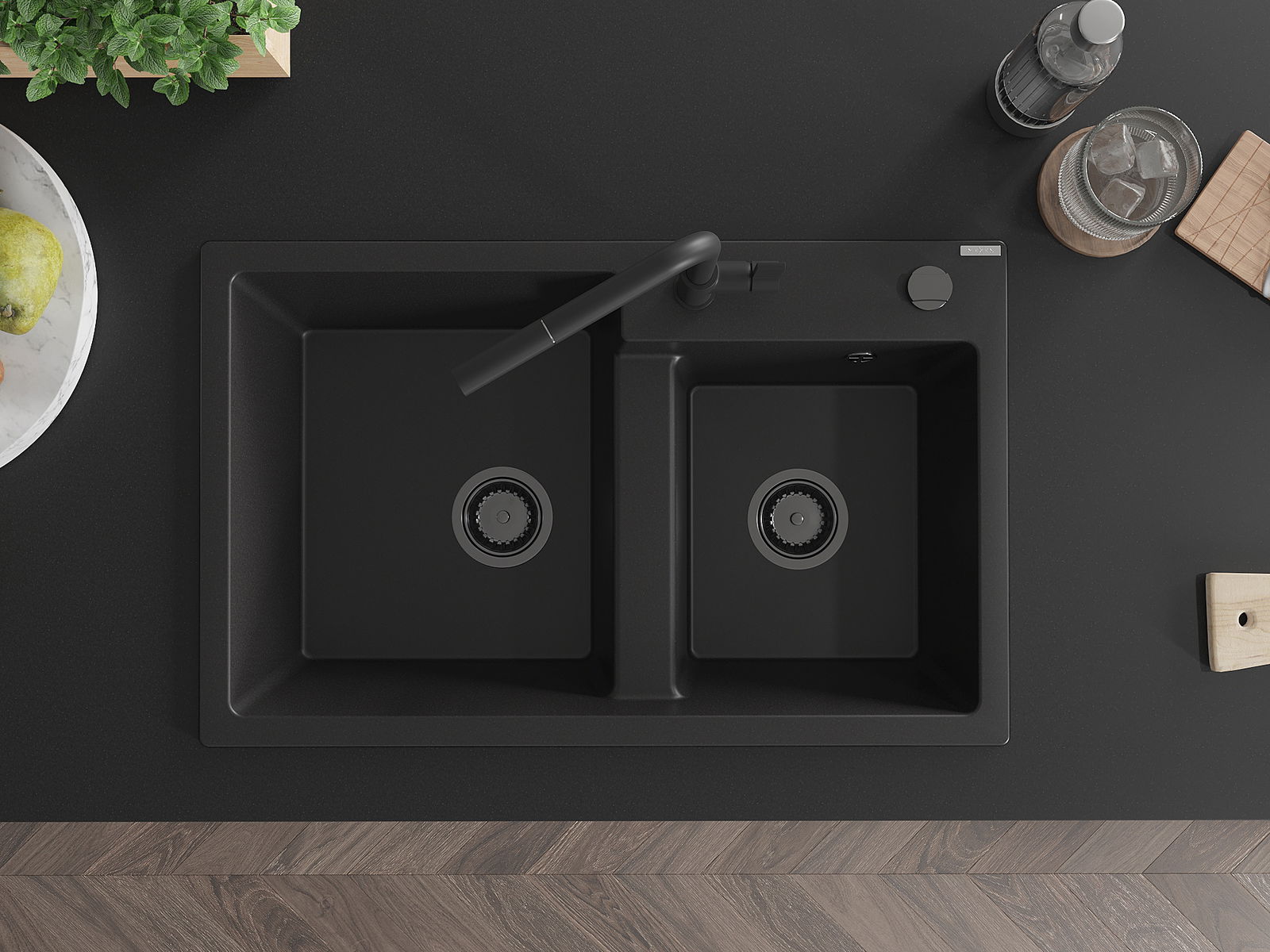 Mexen Tomas granitový drez 2-komorový s kuchynskou batériou Flora, čierny - 6516-77-670401-70-B