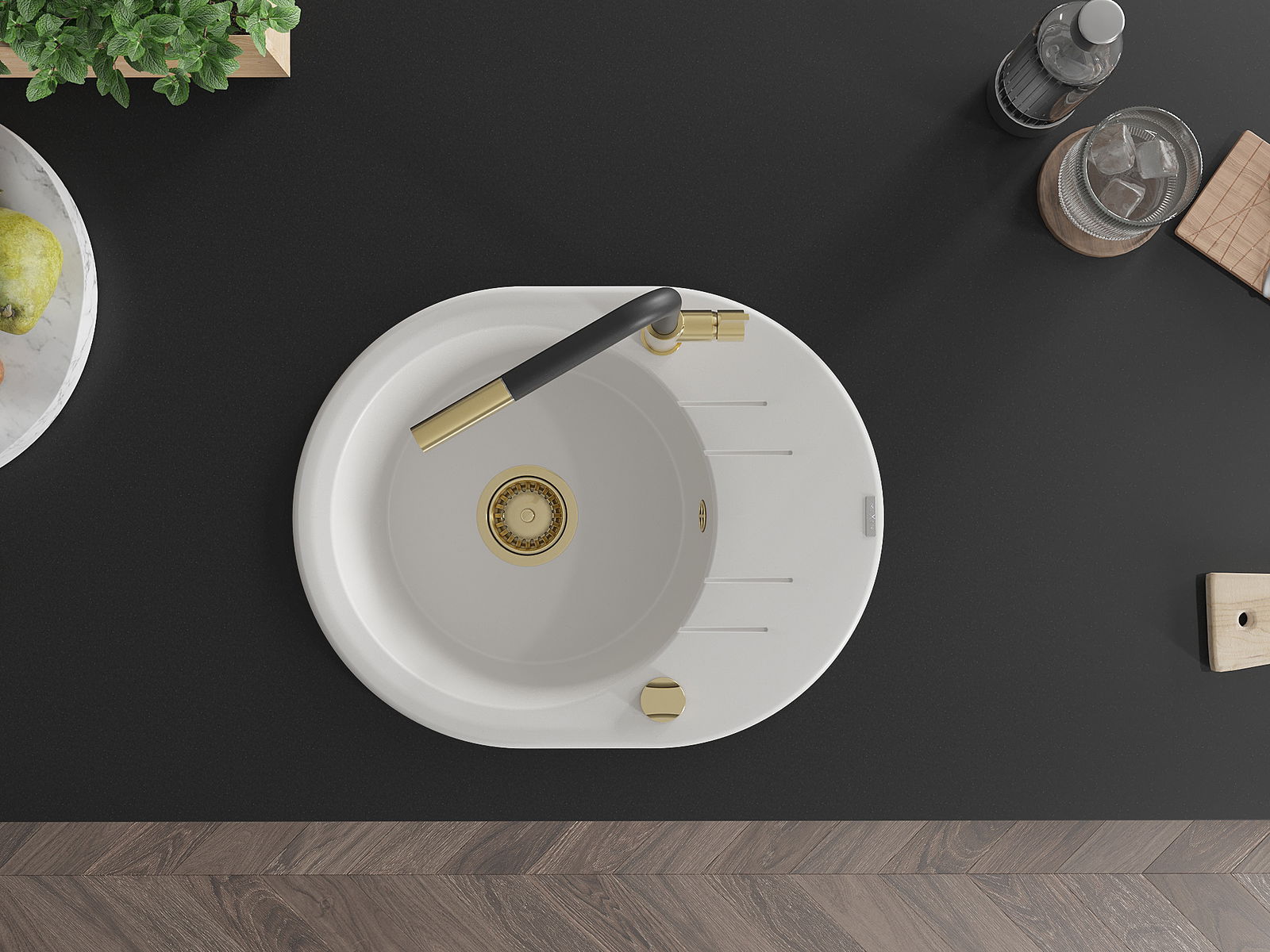 Mexen Kevin granitový drez s 1-komorou s odkvapkávačom a kuchynskou batériou Flora, biela - 6517-20-670401-57-G