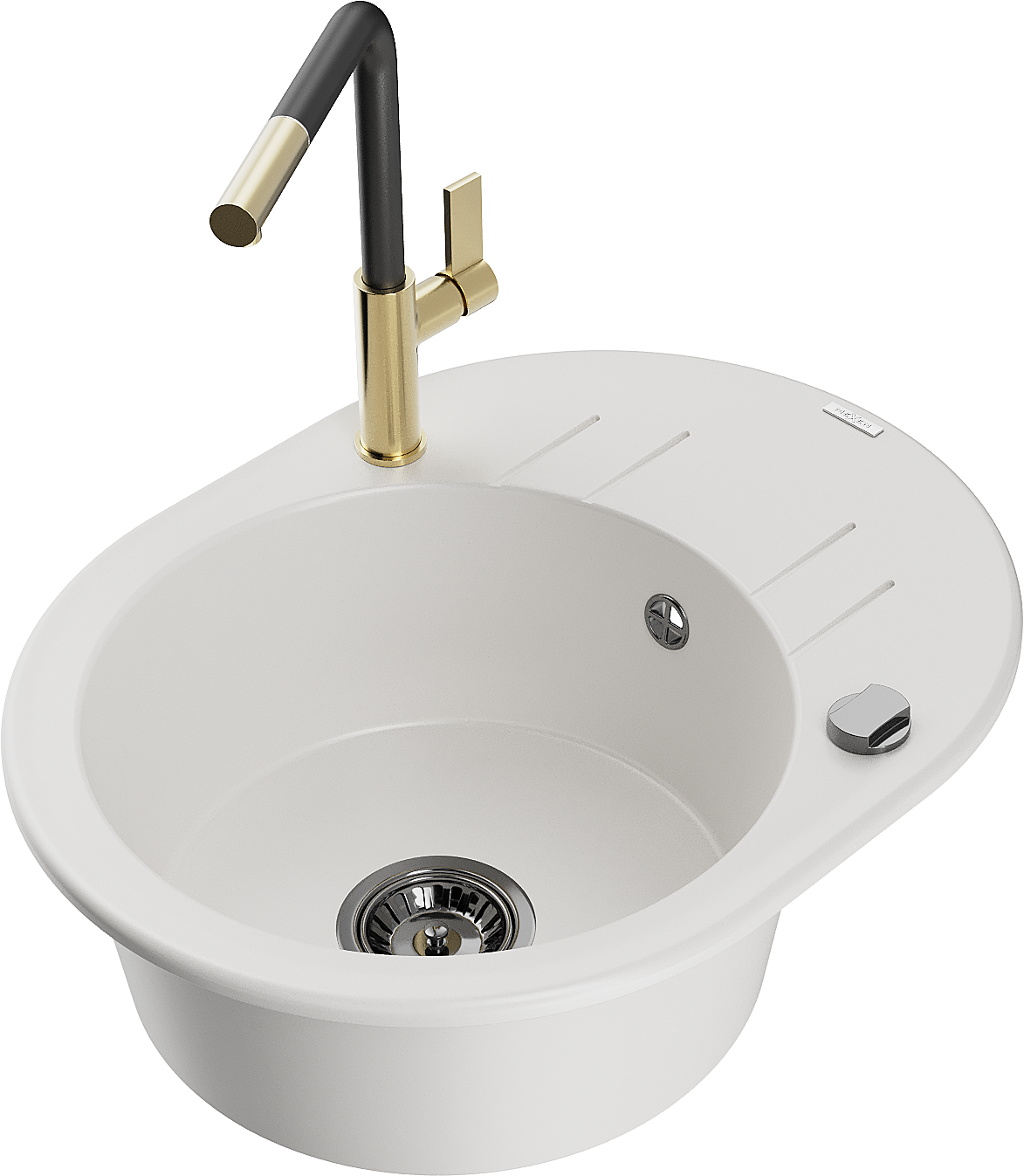 Mexen Kevin granitový drez 1-komorový s odkvapkávačom a kuchynskou batériou Flora, biely - 6517-20-670401-57-B