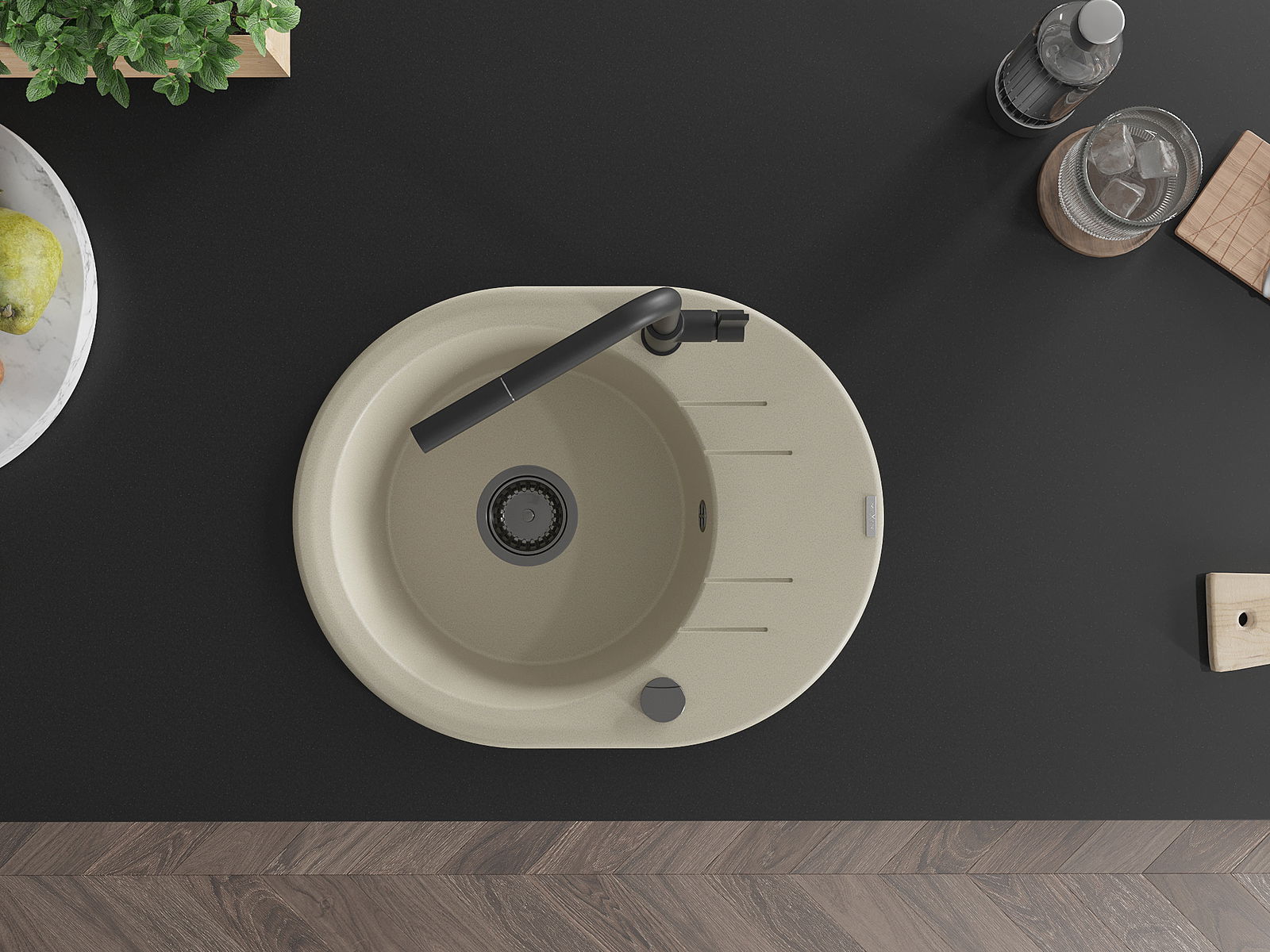Povrch umývadla je odolný voči škvrnám a sfarbeniu, vďaka čomu sa ľahko čistí a zachováva si svoju farbu po dlhú dobu. Estetický a prakticky dopĺňajúci každú kuchyňu.