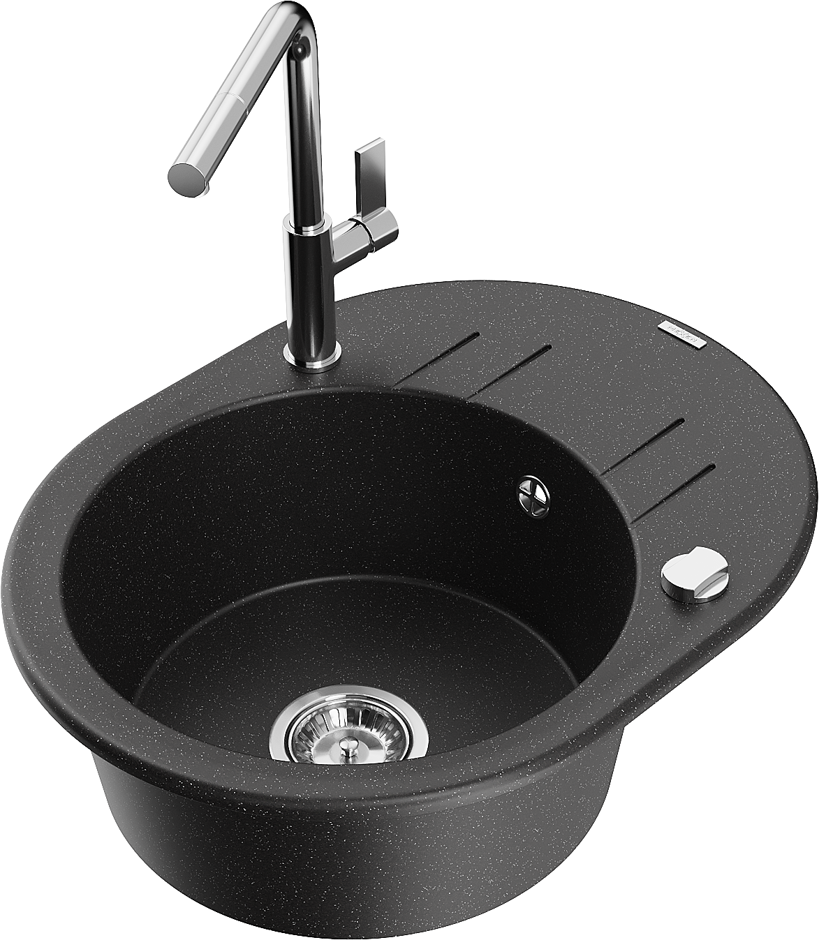 Mexen Kevin granitový drez s jednou komorou s odkvapkávacou plochou a kuchynskou batériou Flora, čierno/strieborný
