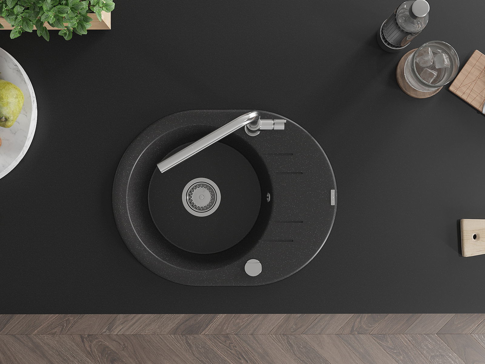 Povrch kuchynského drezu je odolný voči škvrnám a zafarbeniu, vďaka čomu sa ľahko udržiava a zachováva svoju farbu počas dlhého obdobia používania. Estetický a praktický doplnok pre každú kuchyňu.