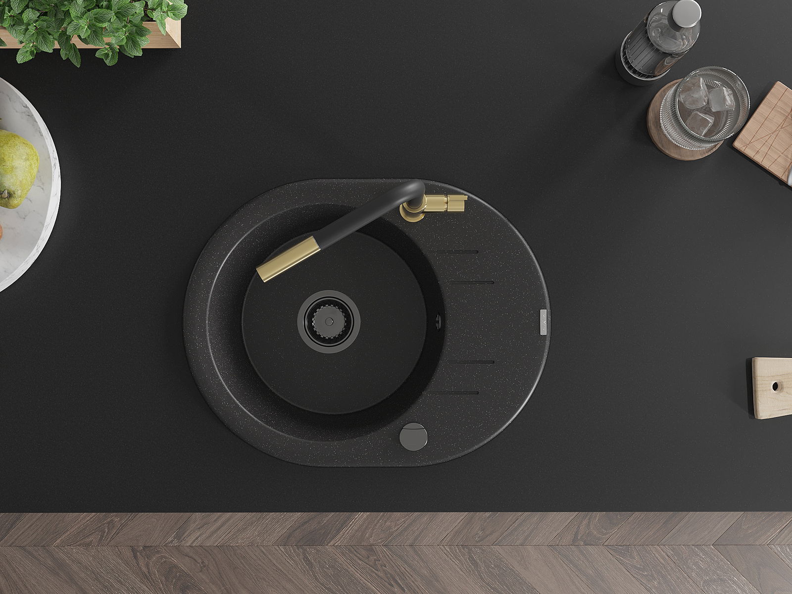 Povrch kuchynského drezu je odolný voči škvrnám a zafarbeniu, vďaka čomu sa ľahko udržiava a zachováva svoju farbu počas dlhého obdobia používania. Estetický a praktický doplnok pre každú kuchyňu.