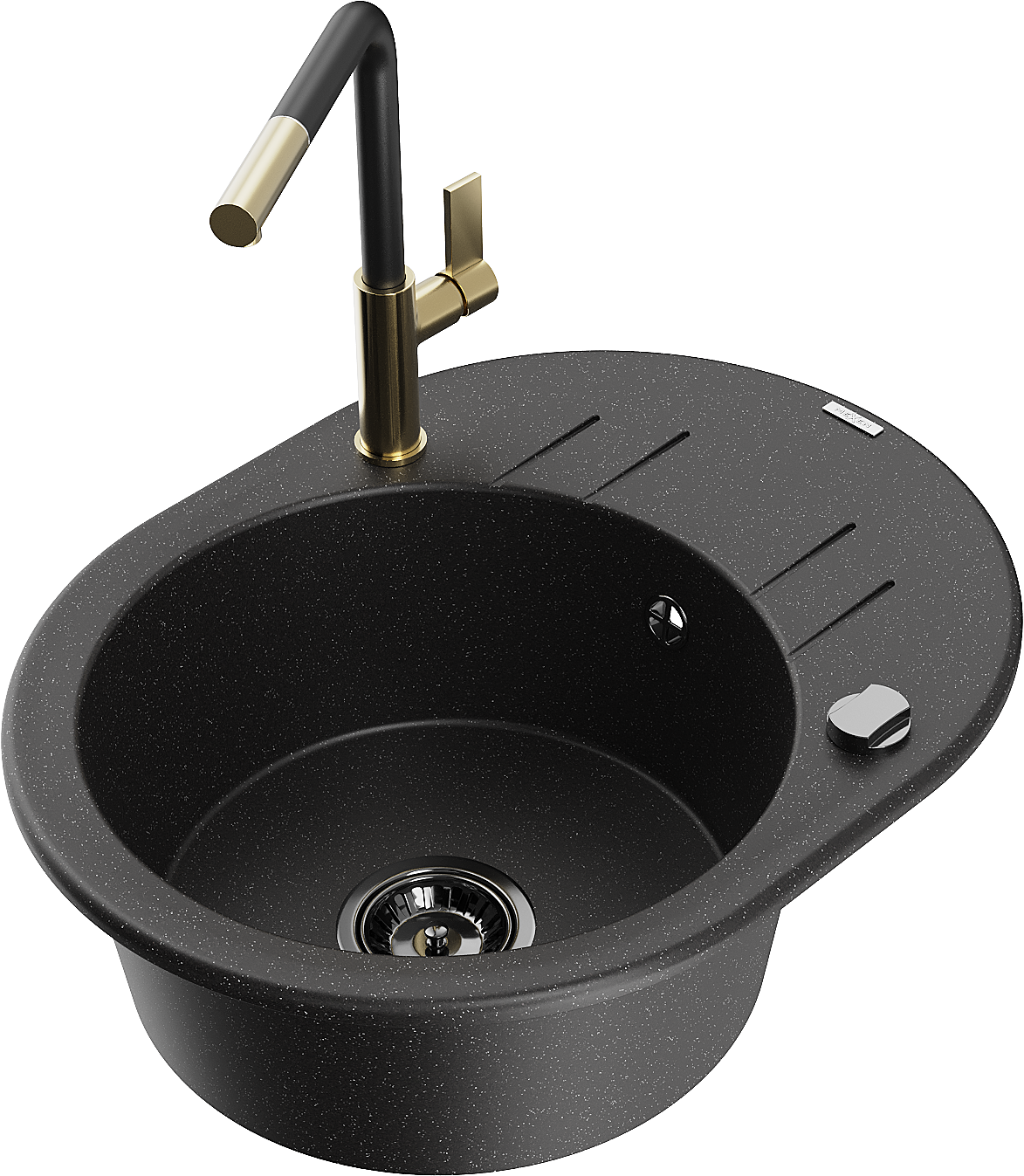 Mexen Kevin granitový jednodrez s odkvapkávačom a kuchynskou batériou Flora, čierny/strieborný metalik