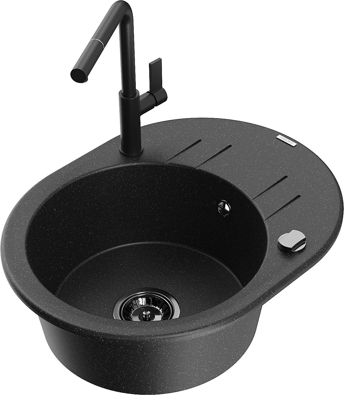 Mexen Kevin granitový drez s 1 komorou, odkvapkávačom a kuchynskou batériou Flora, čierny/strieborný metalický