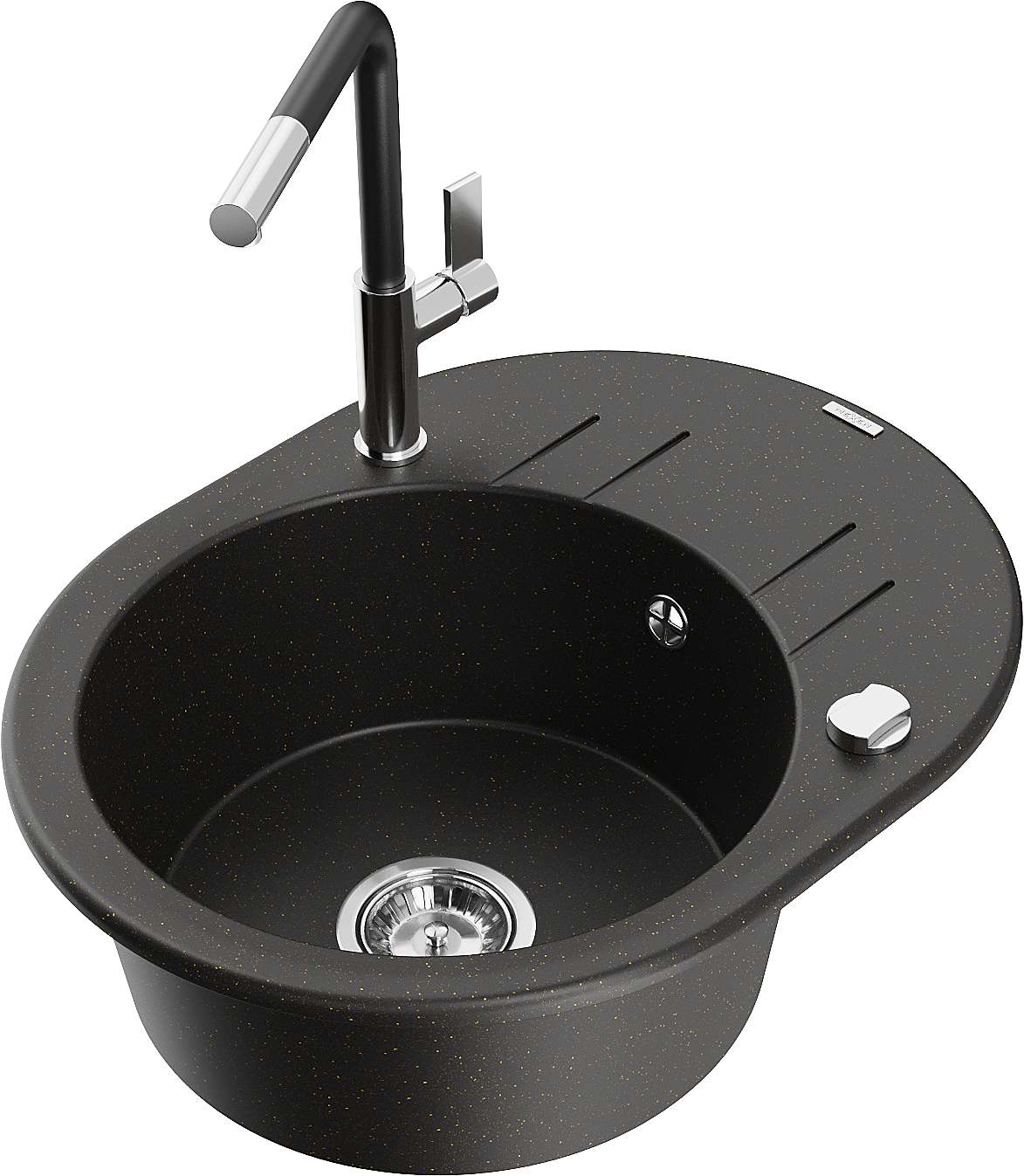Mexen Kevin žulový drez 1-komorový s odkvapkávačom a kuchynskou batériou Flora, čierny/zlatý metalik - 6517-75-670401-07